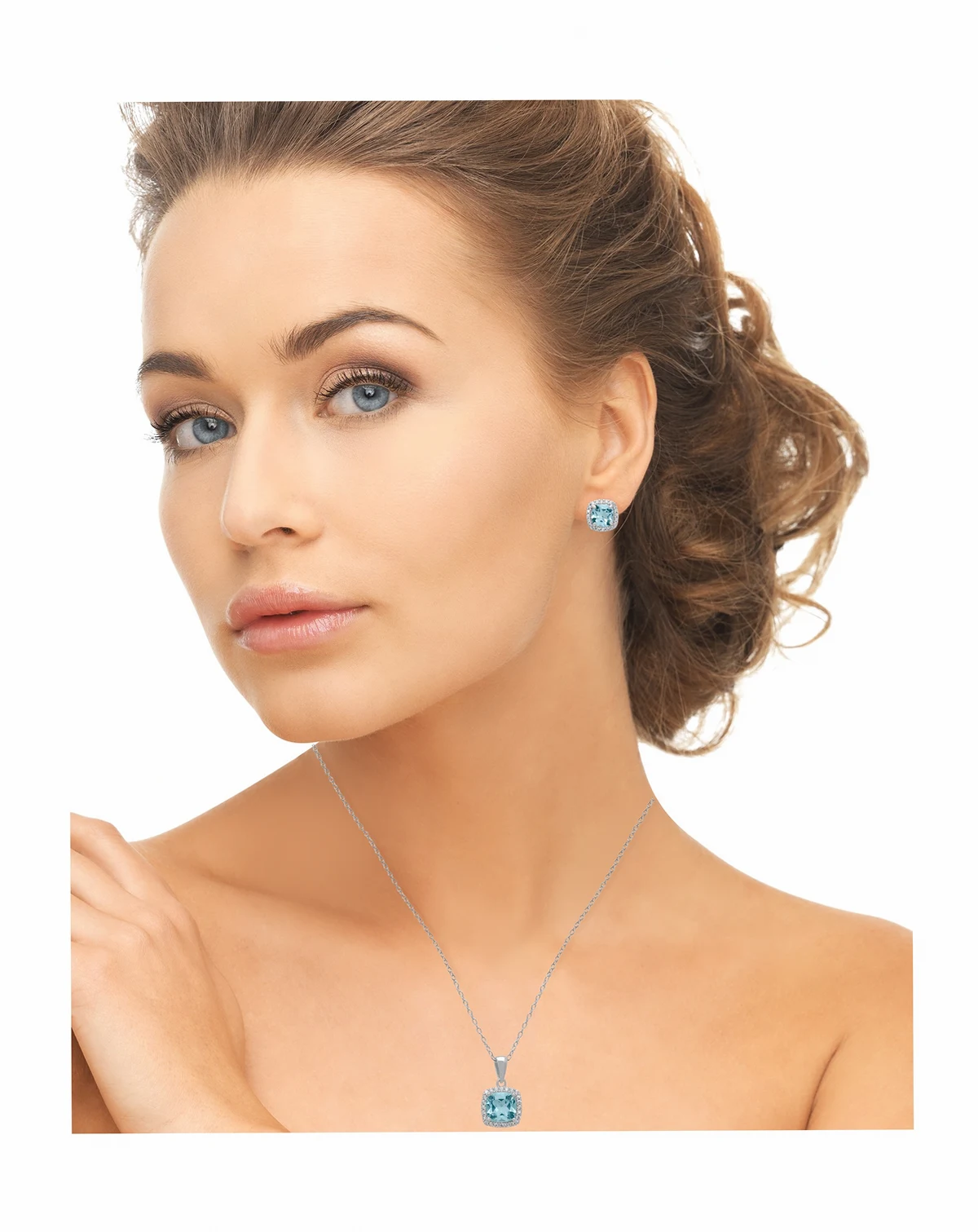 Create a coordinated jewelry look with this two-piece set from Macy's. A cushion blue topaz pendant features a sparkling halo and pairs with matching drop earrings. Also available in Amethyst & Citrine.