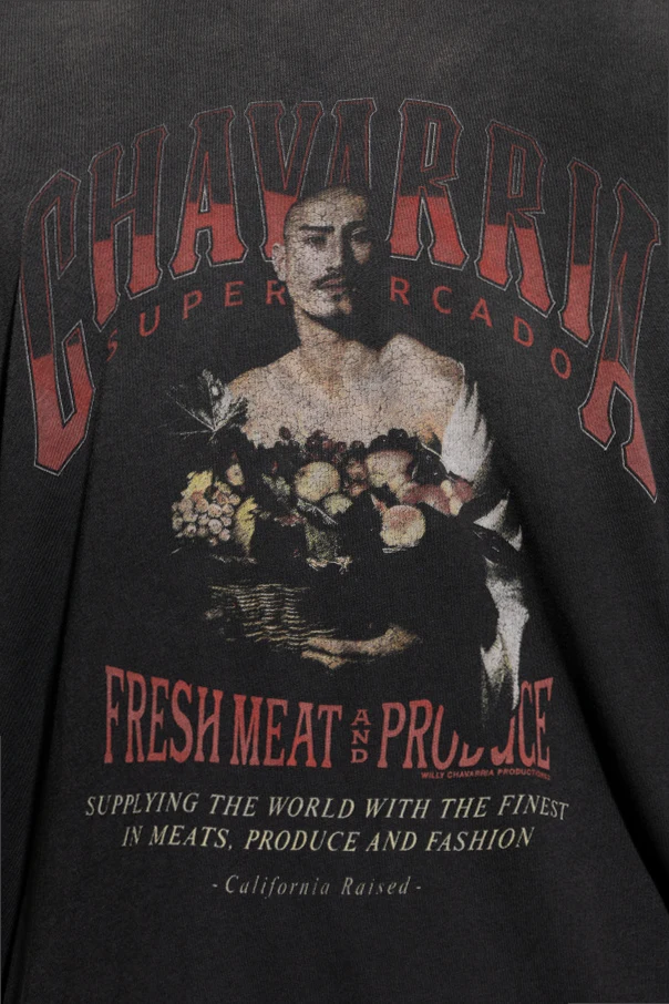 Crafted from high-quality, medium-weight cotton with a sophisticated matte finish, this piece delivers exceptional comfort and tactile pleasure. The vibrant front print features an evocative, painterly portrait of a man bearing a basket of fruits and vegetables—artfully accented by bold lettering and stylized script, including "CHAVARRIA SUPERMERCADO" and "FRESH MEAT AND PRODUCE." A subtle line—"Supplying the world with the finest in meats, produce and fashion – California Raised"—underscores the garment’s unique narrative.