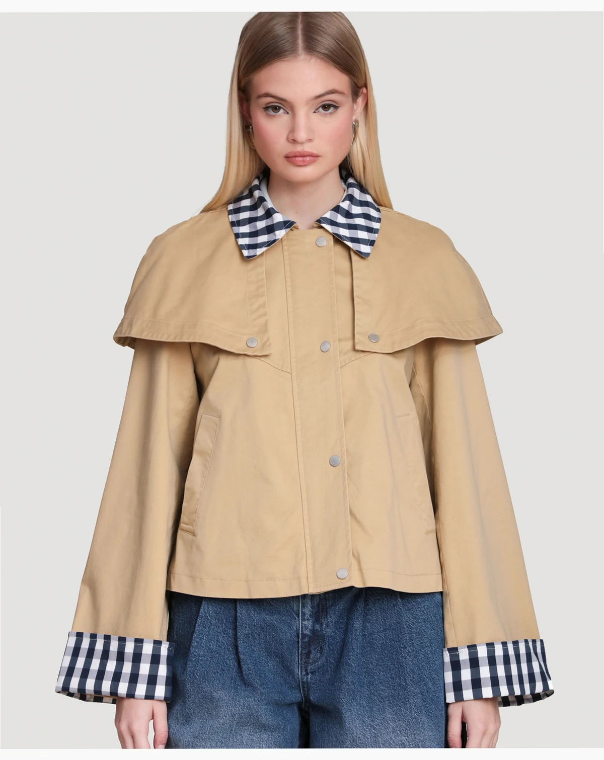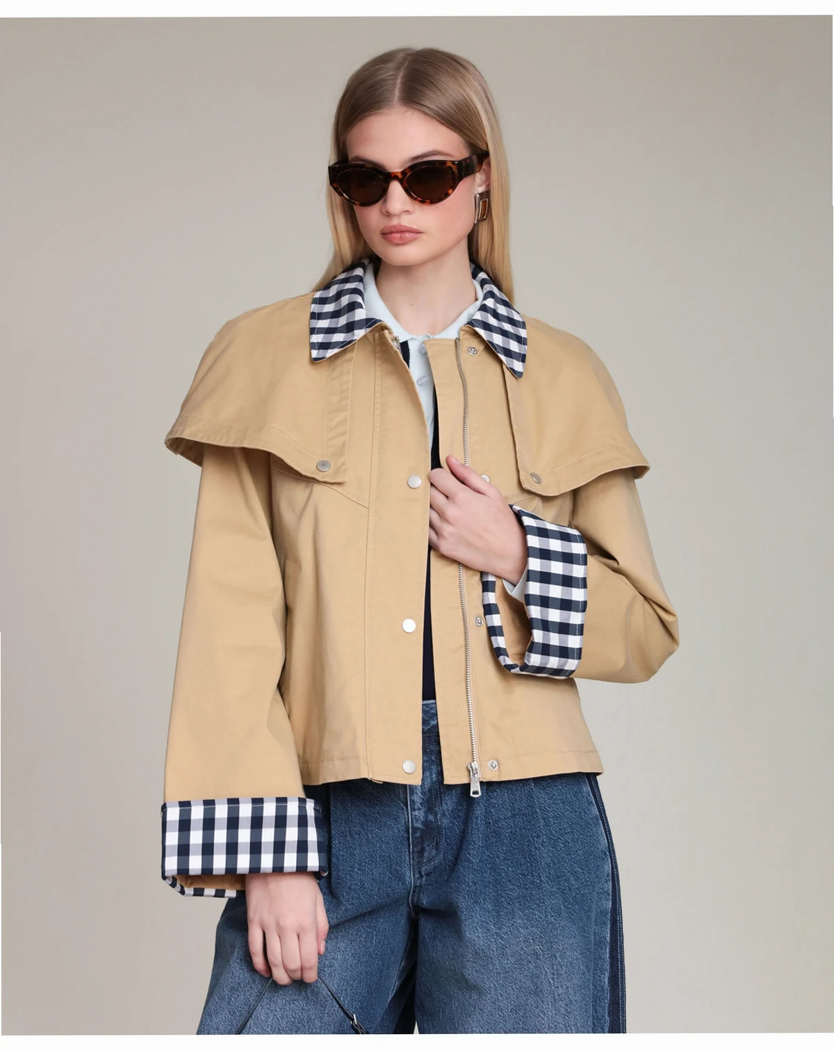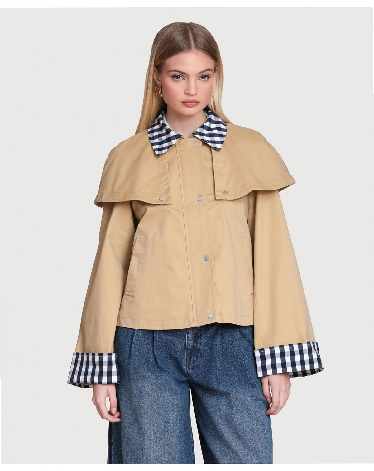 Infused with modern elegance, this Avec Les Filles short trench cape jacket elevates everyday outerwear with structured detailing. The long sleeves, front zipper, and side pockets ensure versatile wearability.