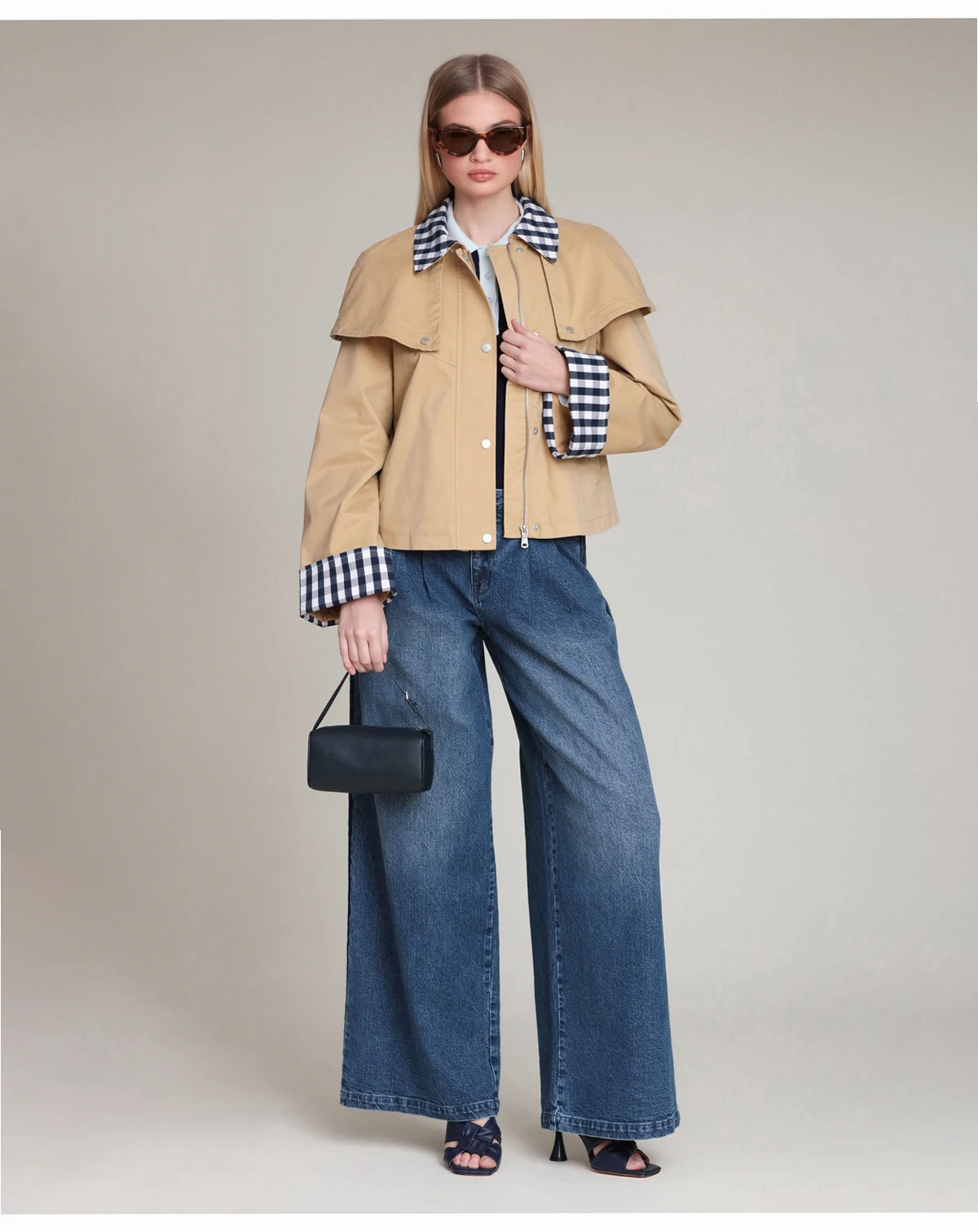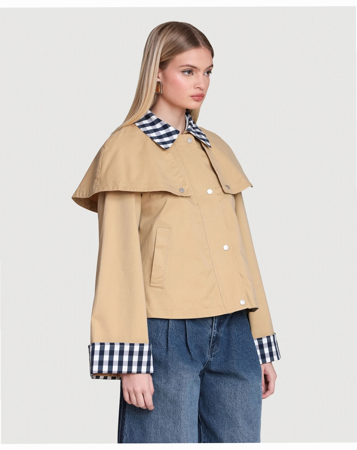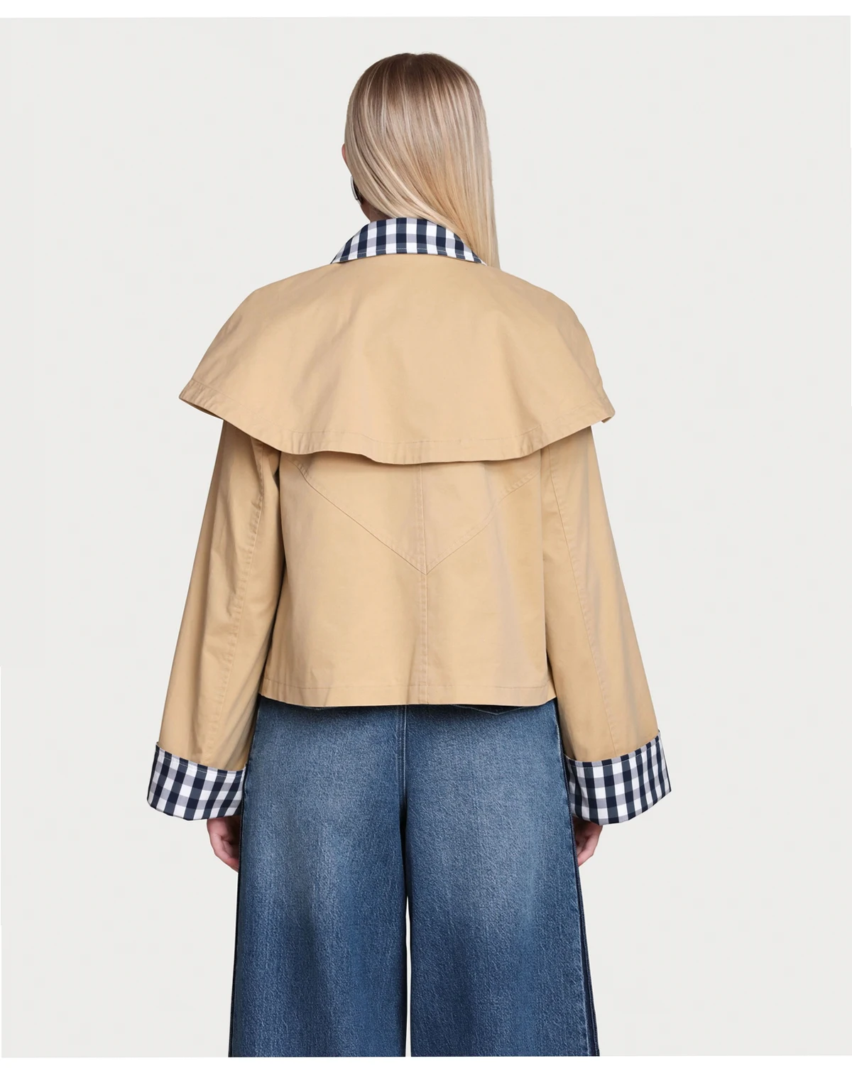 Infused with modern elegance, this Avec Les Filles short trench cape jacket elevates everyday outerwear with structured detailing. The long sleeves, front zipper, and side pockets ensure versatile wearability.