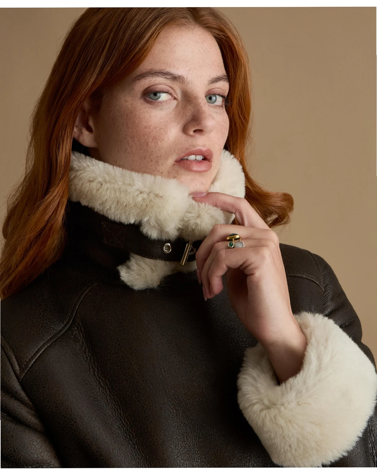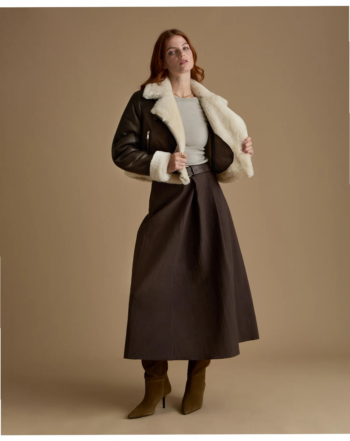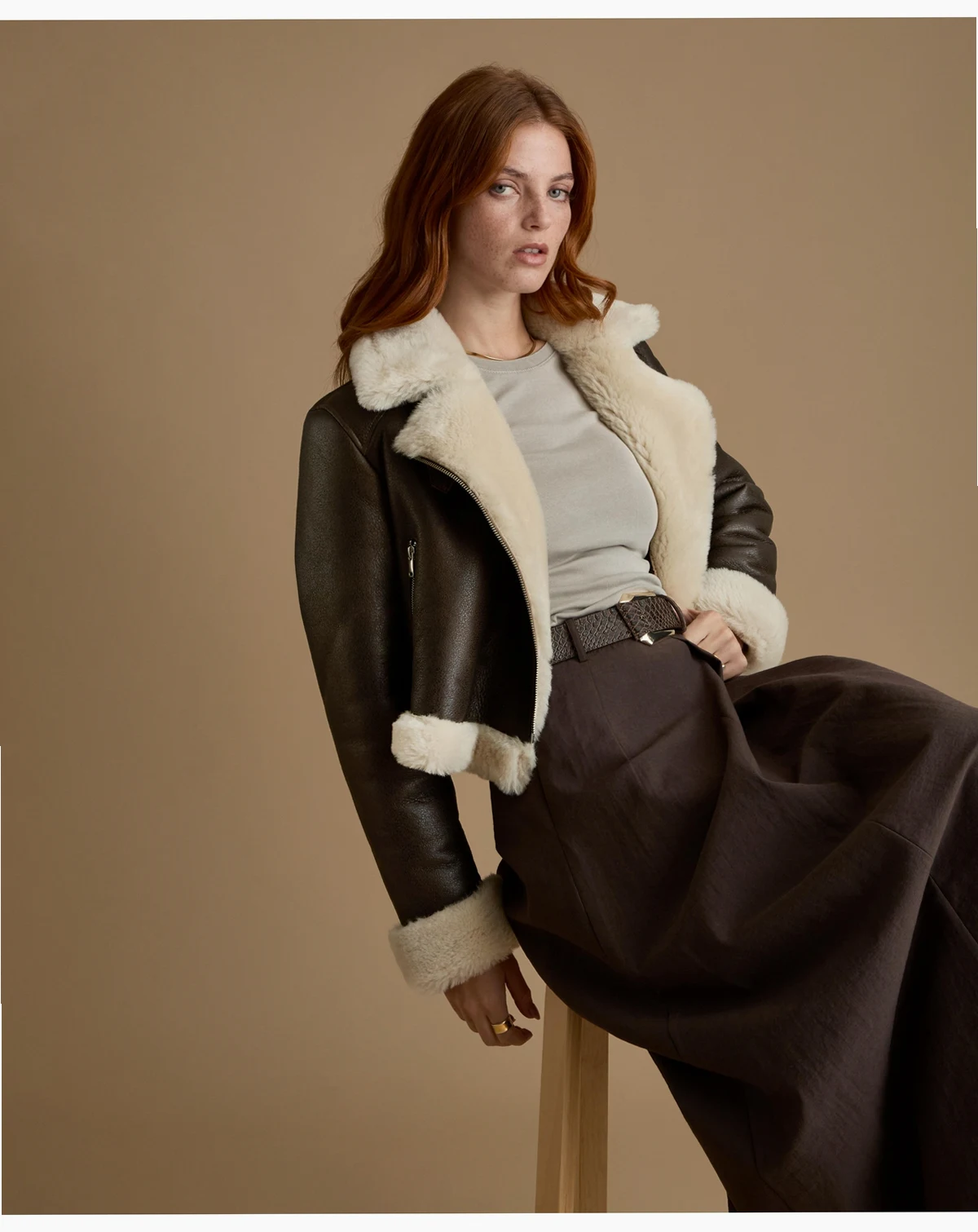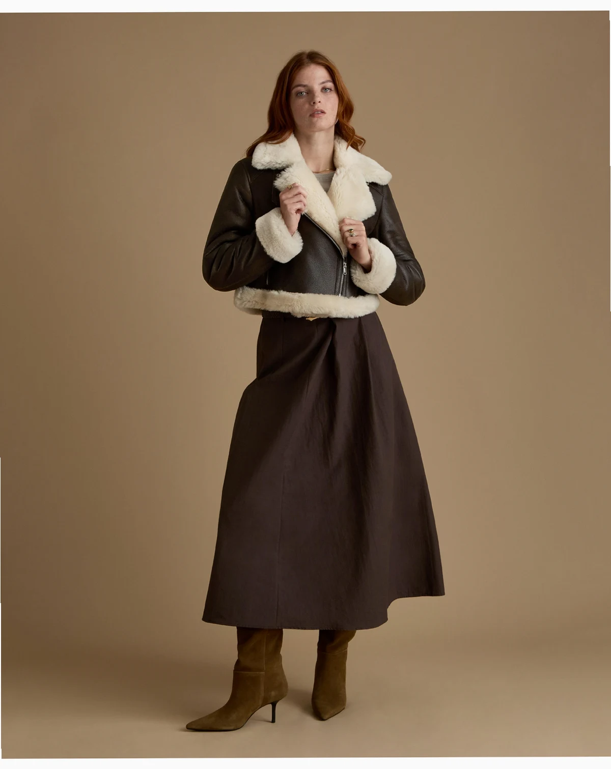 Our Furniq UK Women's Cropped Aviator Style Shearling Jacket with Contrast Trim is crafted from premium shearling. The smooth dark brown exterior contrasts with the cream shearling collar, cuffs, and hem for an authentic heritage finish. Designed with a clean cropped silhouette, it features an off center zip, metal hardware, and practical zipped pockets.