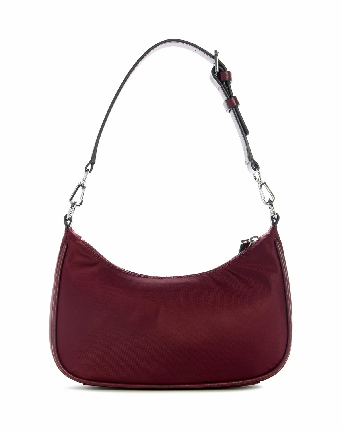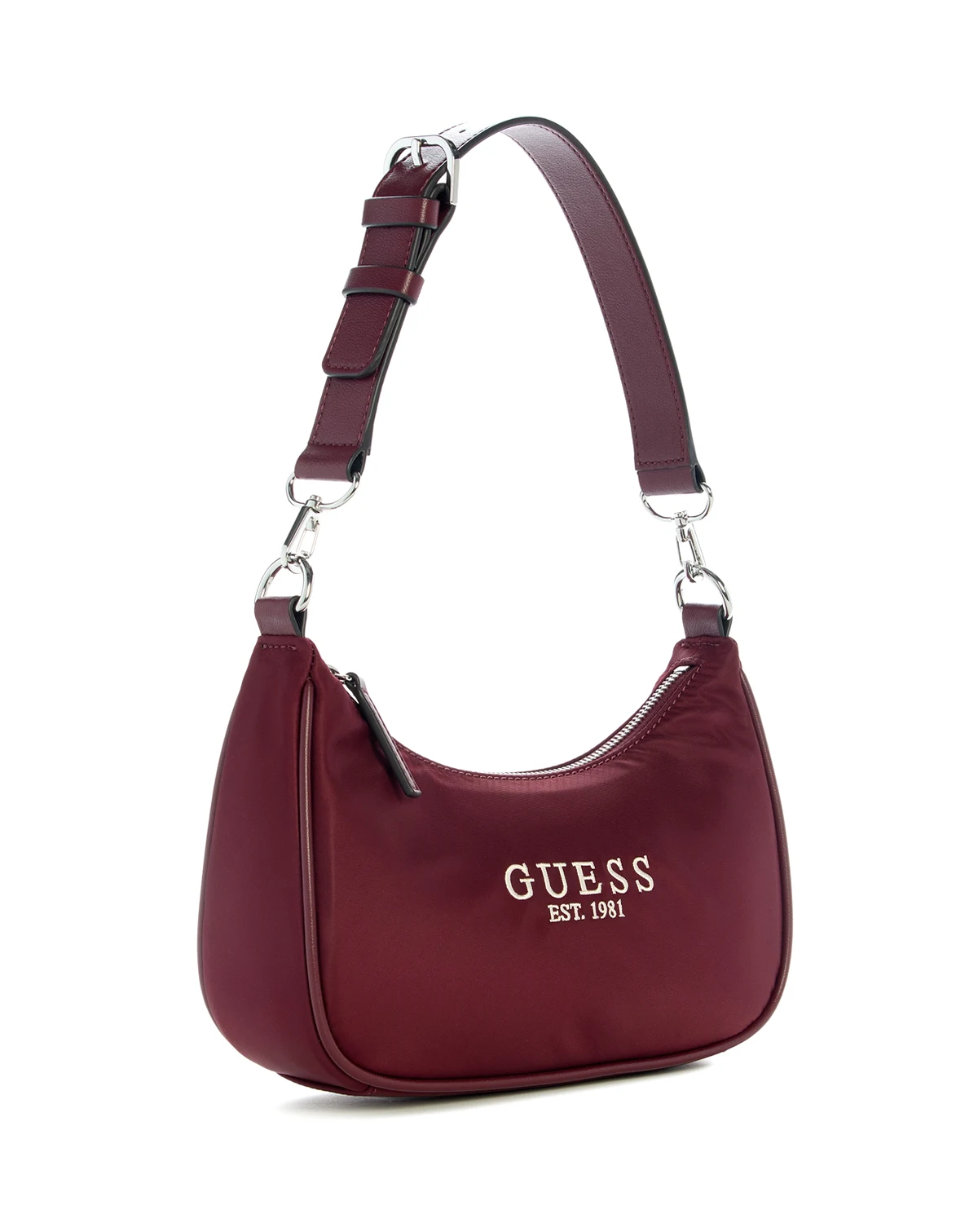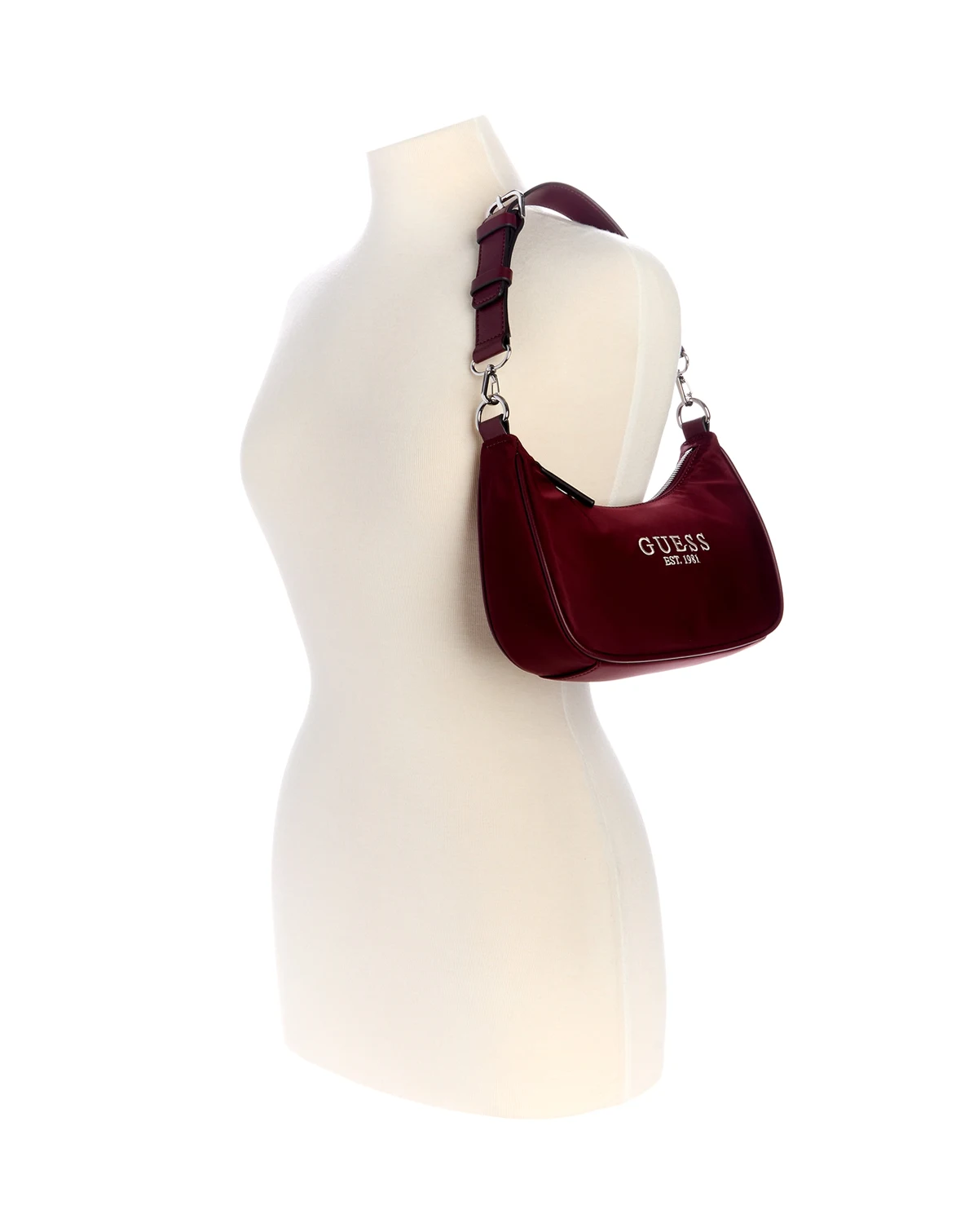Sleek and stylish, this GUESS Arona bag features a shiny silver finish with a secure zipper closure for a polished look. Inside, it offers a zip pocket and one card slot to keep essentials organized. Compact yet functional, the small shoulder handbag fits all phones, great for nights out or hands-free errands.