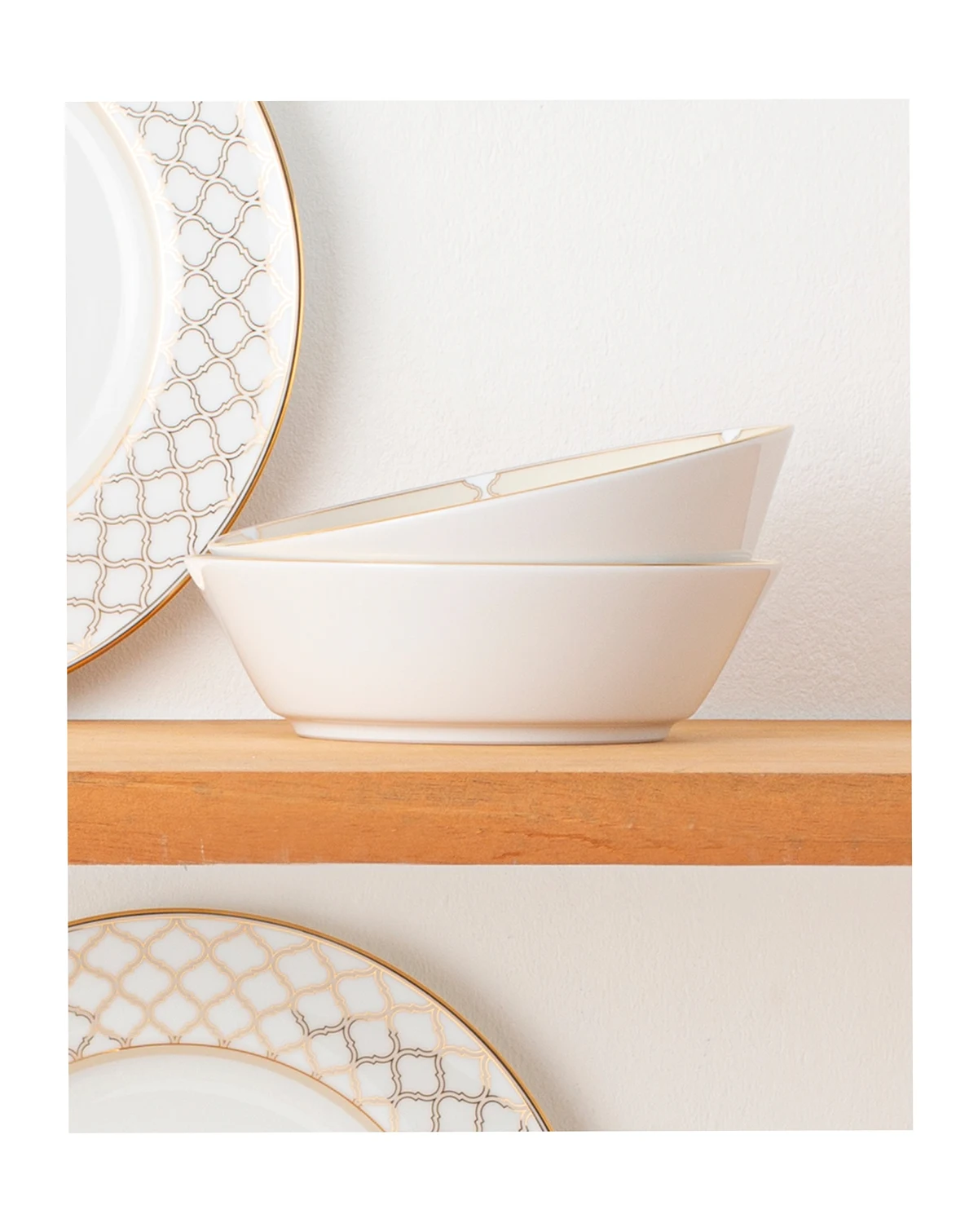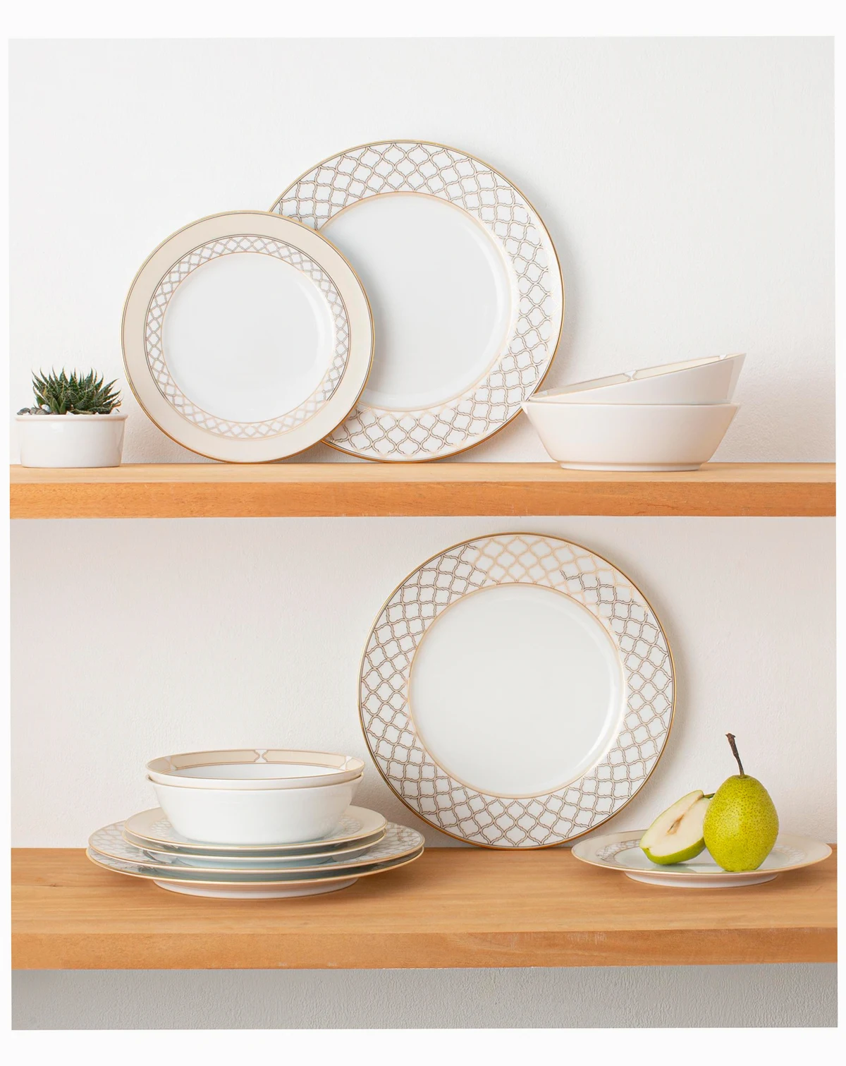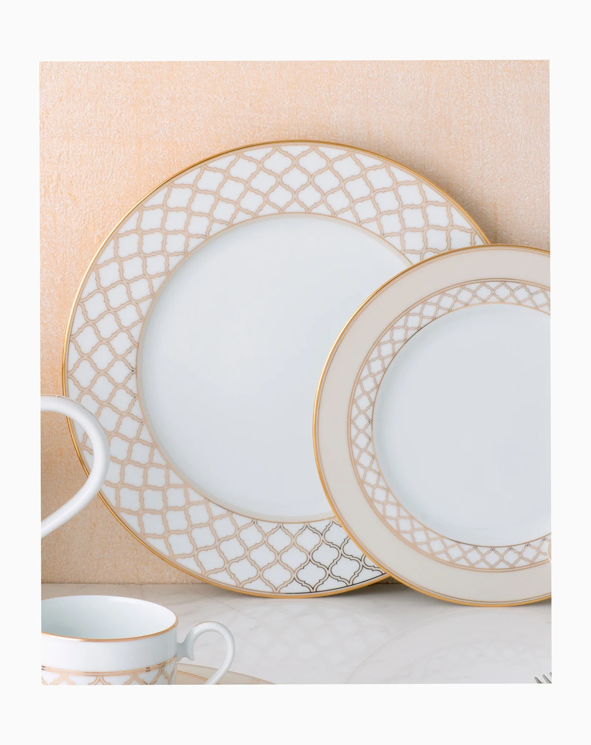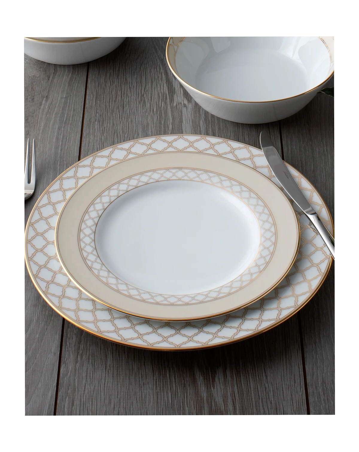 Gold features an interlocking stylized ogee design, presented in multiple sizes on different pieces for maximum impact. These modern elements are paired with solid presentations of gold classic platinum banding.