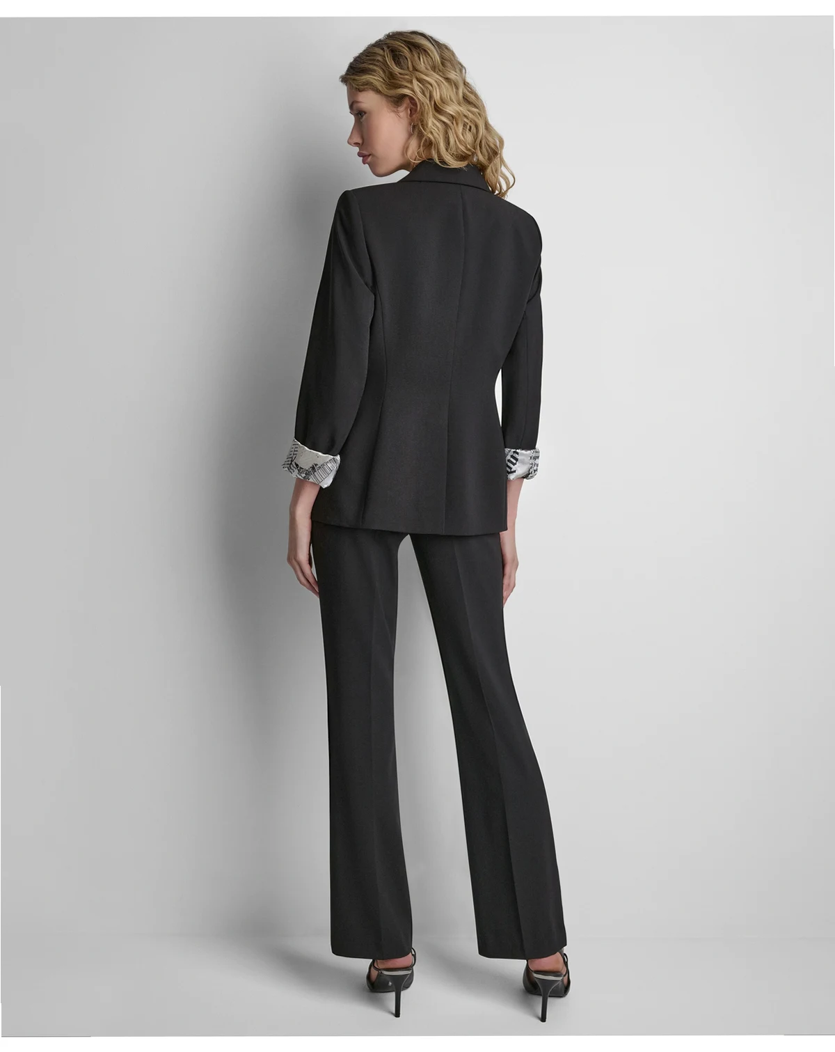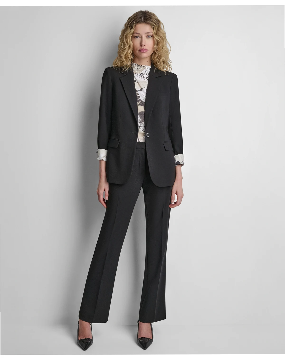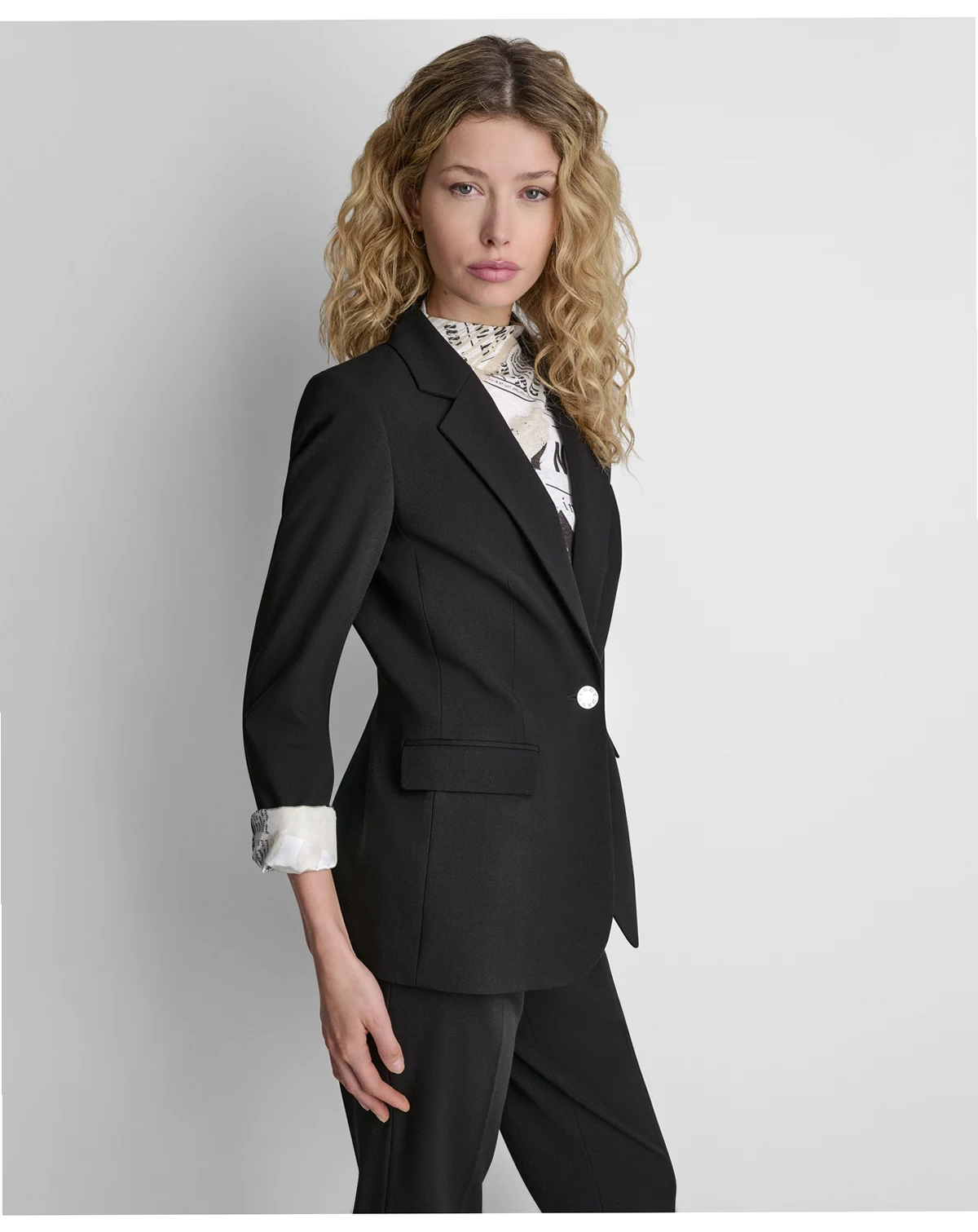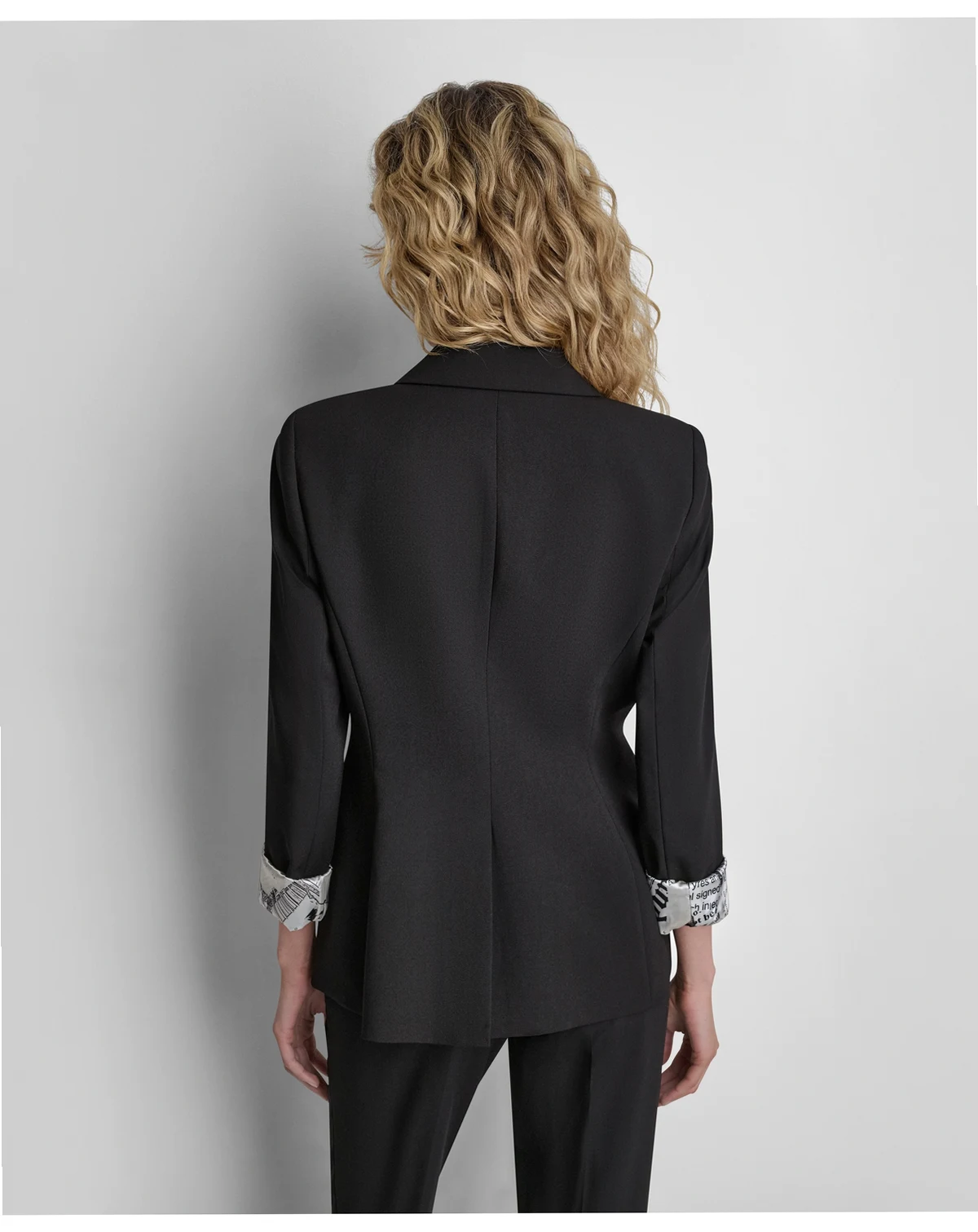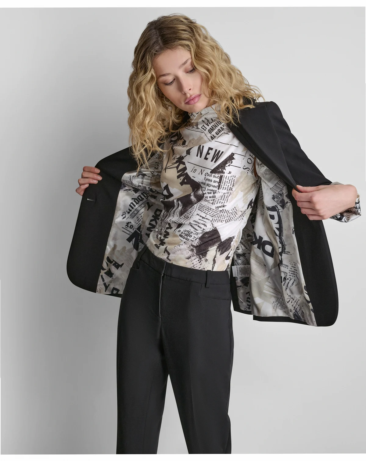 Add an element of intrigue to your wardrobe with this one-button DKNY blazer, detailed with subtle newspaper-print accents at the cuffs. The notch lapel and flap pockets offer a classic yet conversation-starting look.