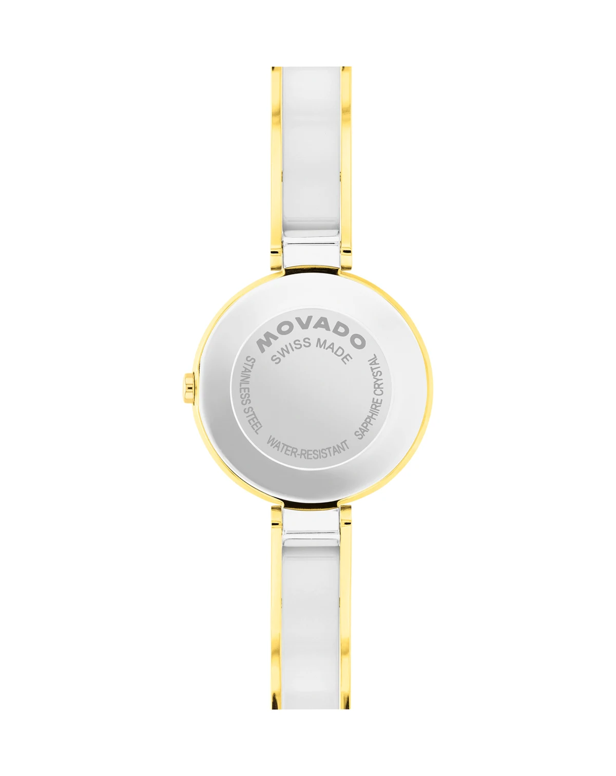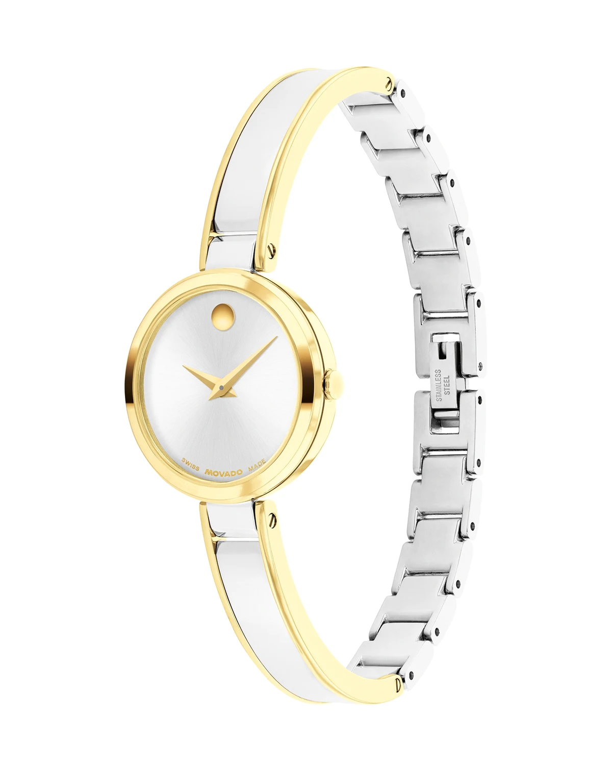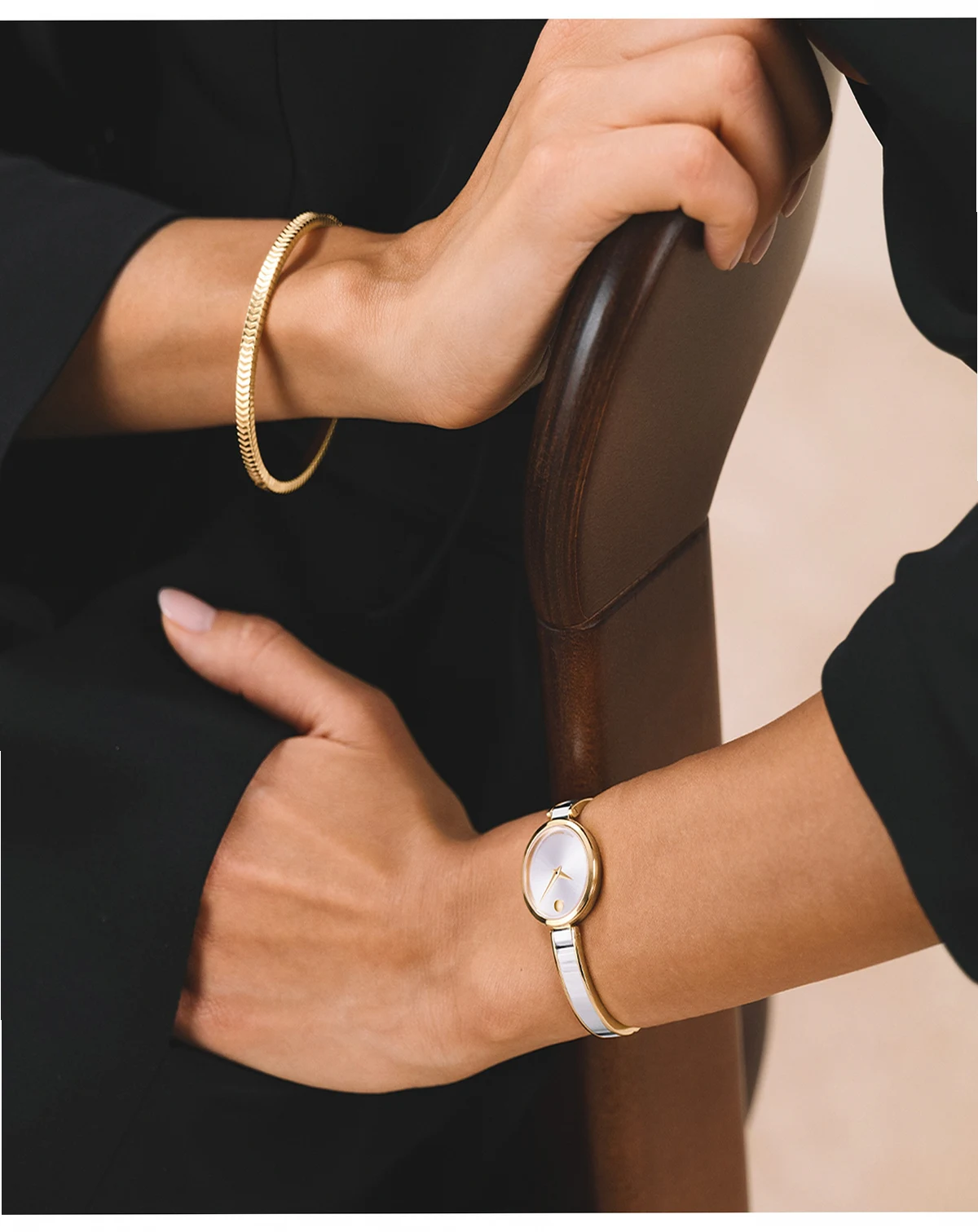 The Moda is defined by a slim, jewelry-inspired bracelet and our iconic Museum Dial. This 24mm watch features a silvery white sunray dial, yellow gold tone dauphine hands, and a bangle bracelet.