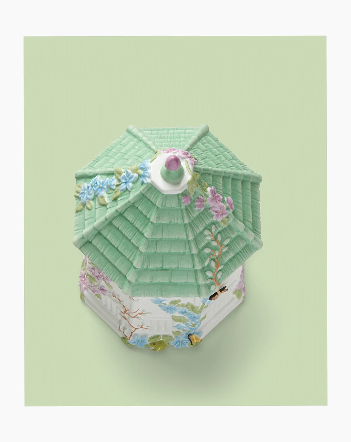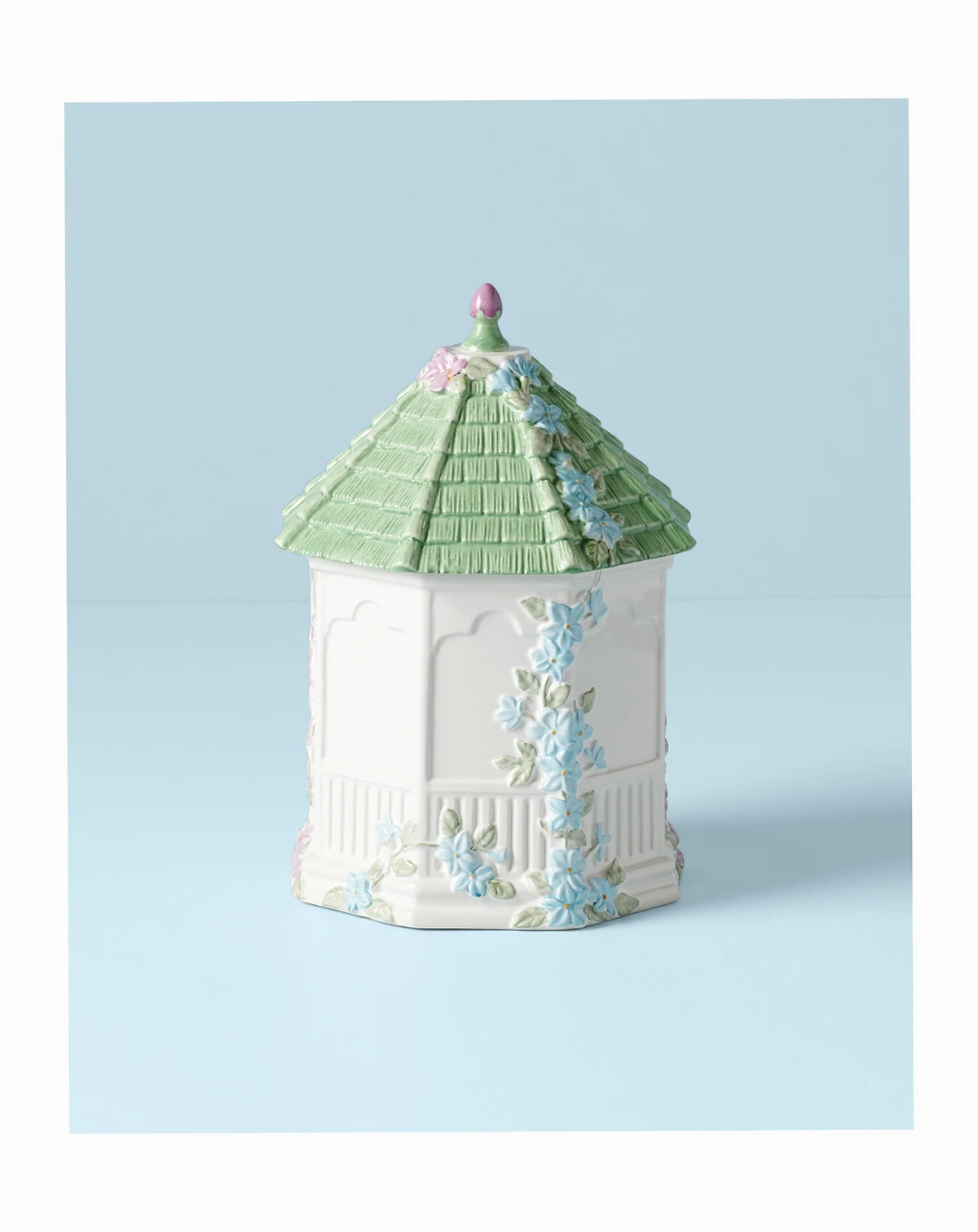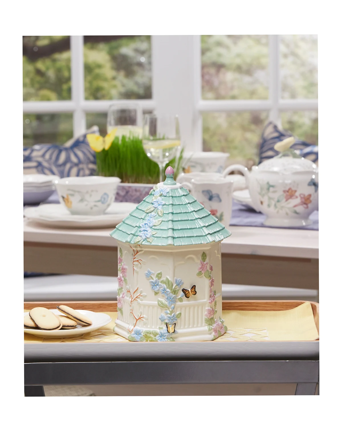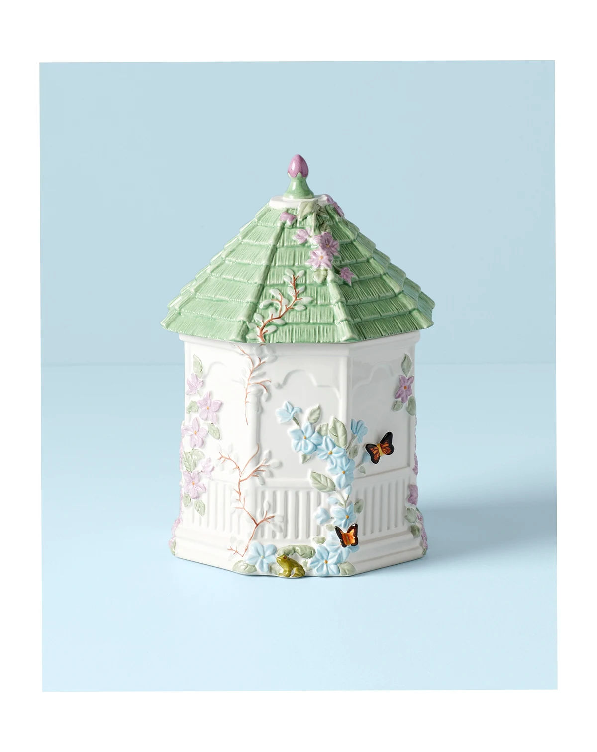 Sweet spot. Embossed with the butterflies and blooms of the beloved Lenox dinnerware pattern, this elaborate Butterfly Meadow cookie jar is shaped like a gazebo and full of whimsical detail.