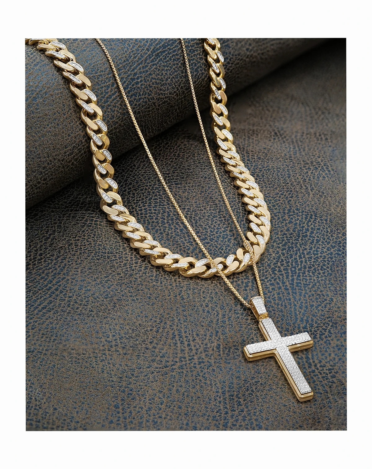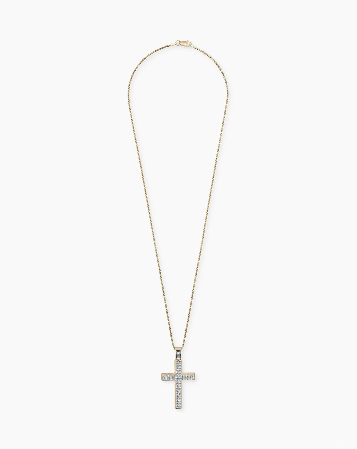 A classic diamond pavé cross glistens this men's box link pendant necklace.