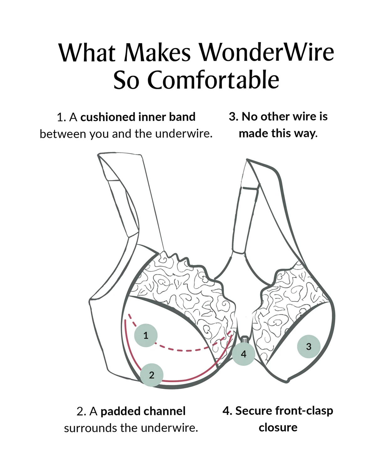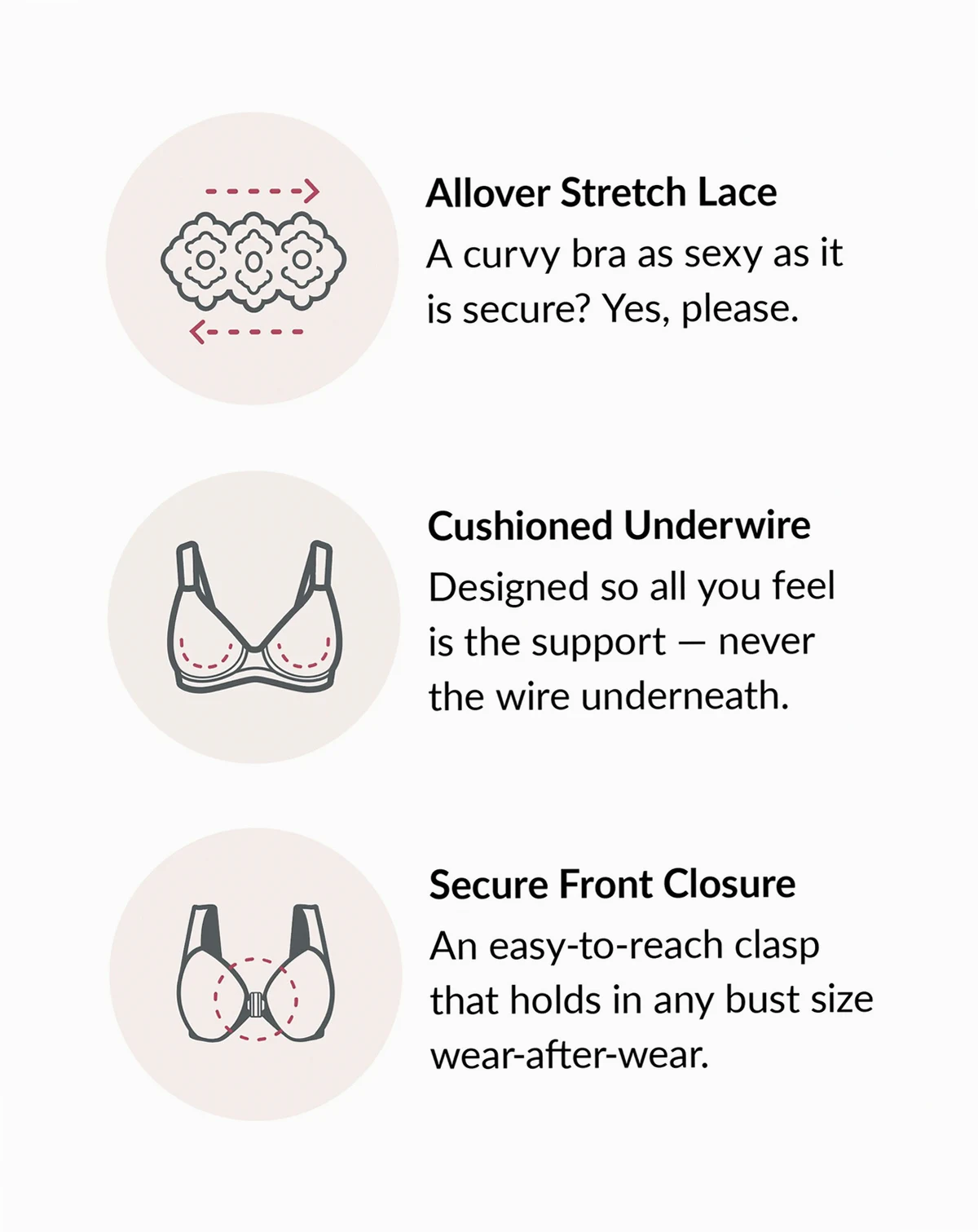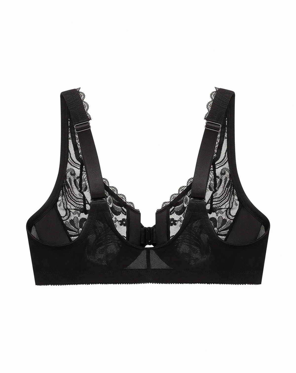 Front close bra provides great support and all day comfort. The beautiful stretch lace cups give your bust a gorgeous look and natural shape. The worry free front closing clasp is designed to keep you secure all day long. Surrounded by three different fabric layers the underwire not only prevents wire-poke but also shapes your bust beautifully.
