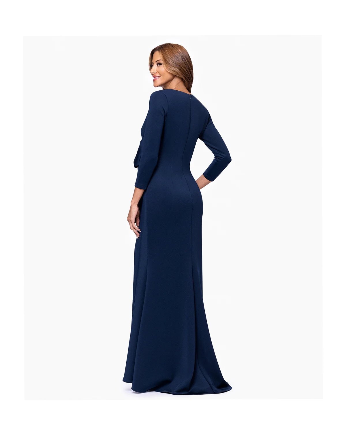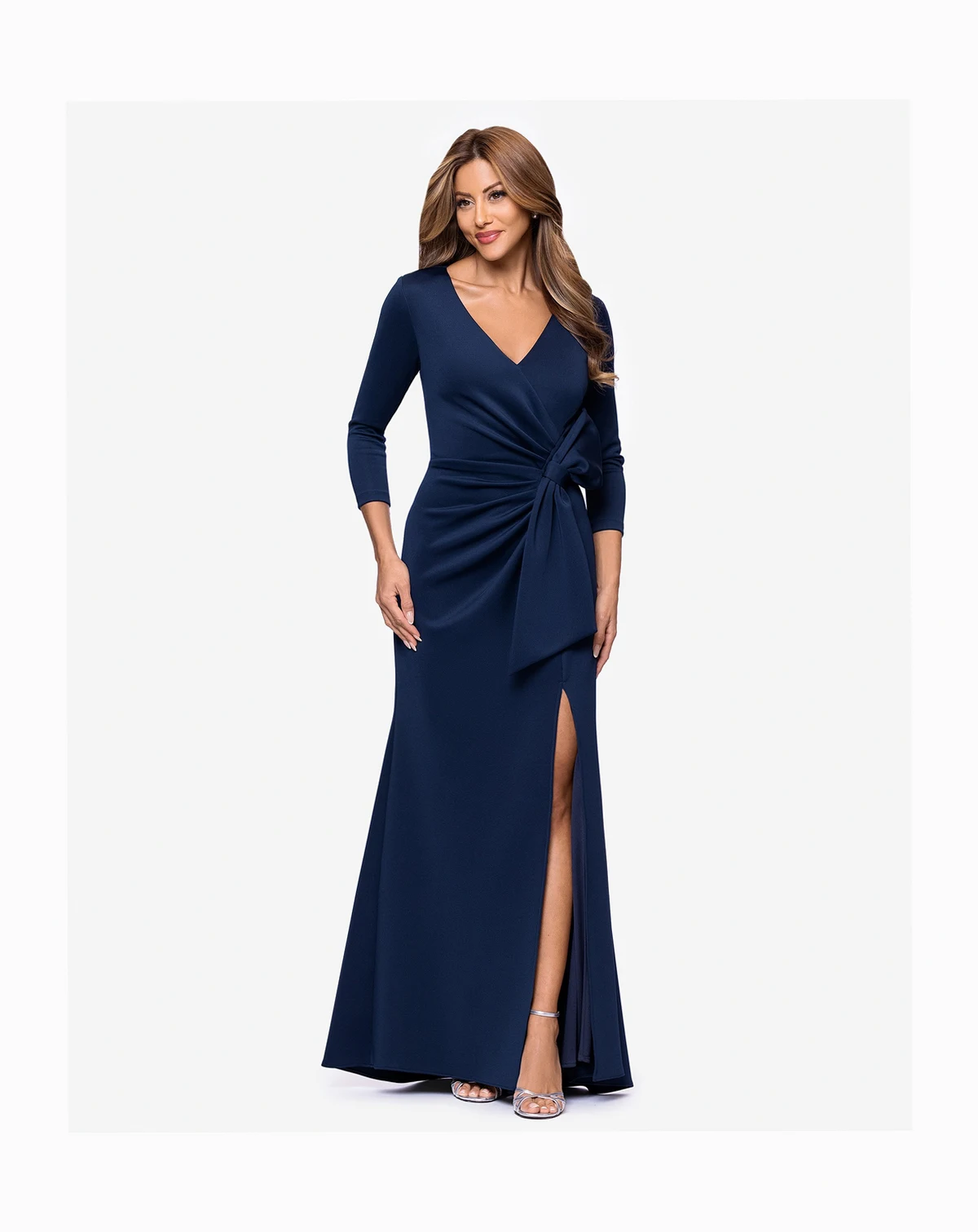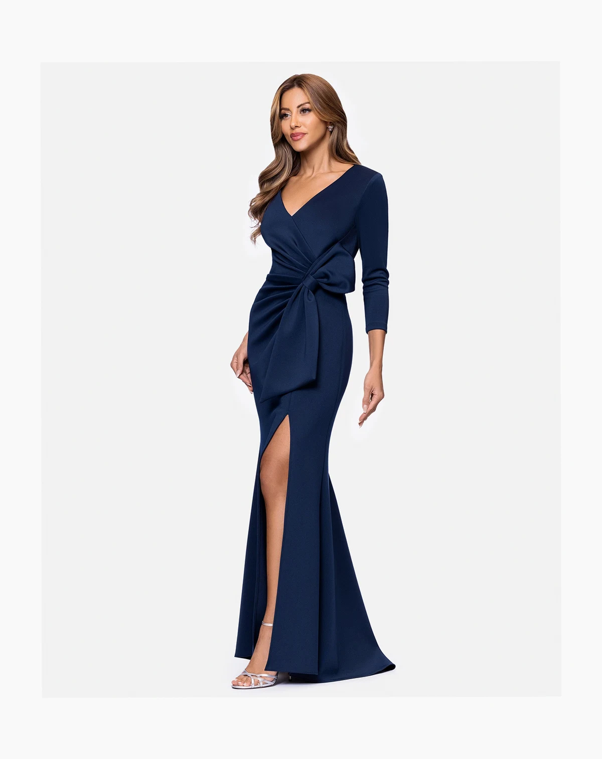 Elevate your formal look with this elegant V-neck dress from XSCAPE, featuring a graceful side bow detail. The long sleeves contribute to a streamlined, sophisticated silhouette.