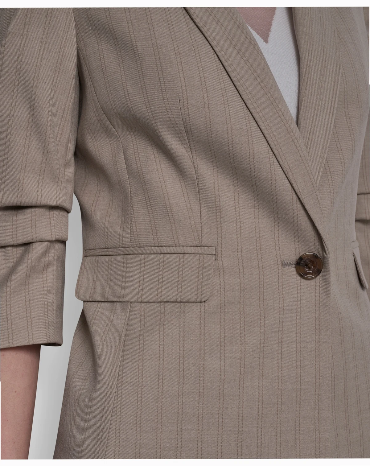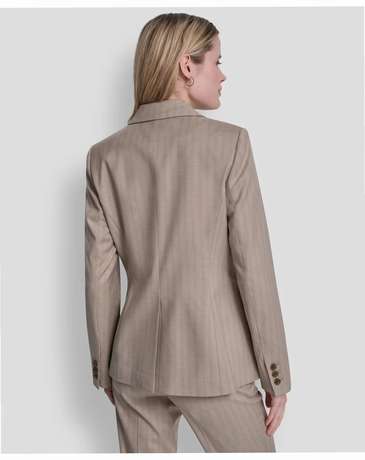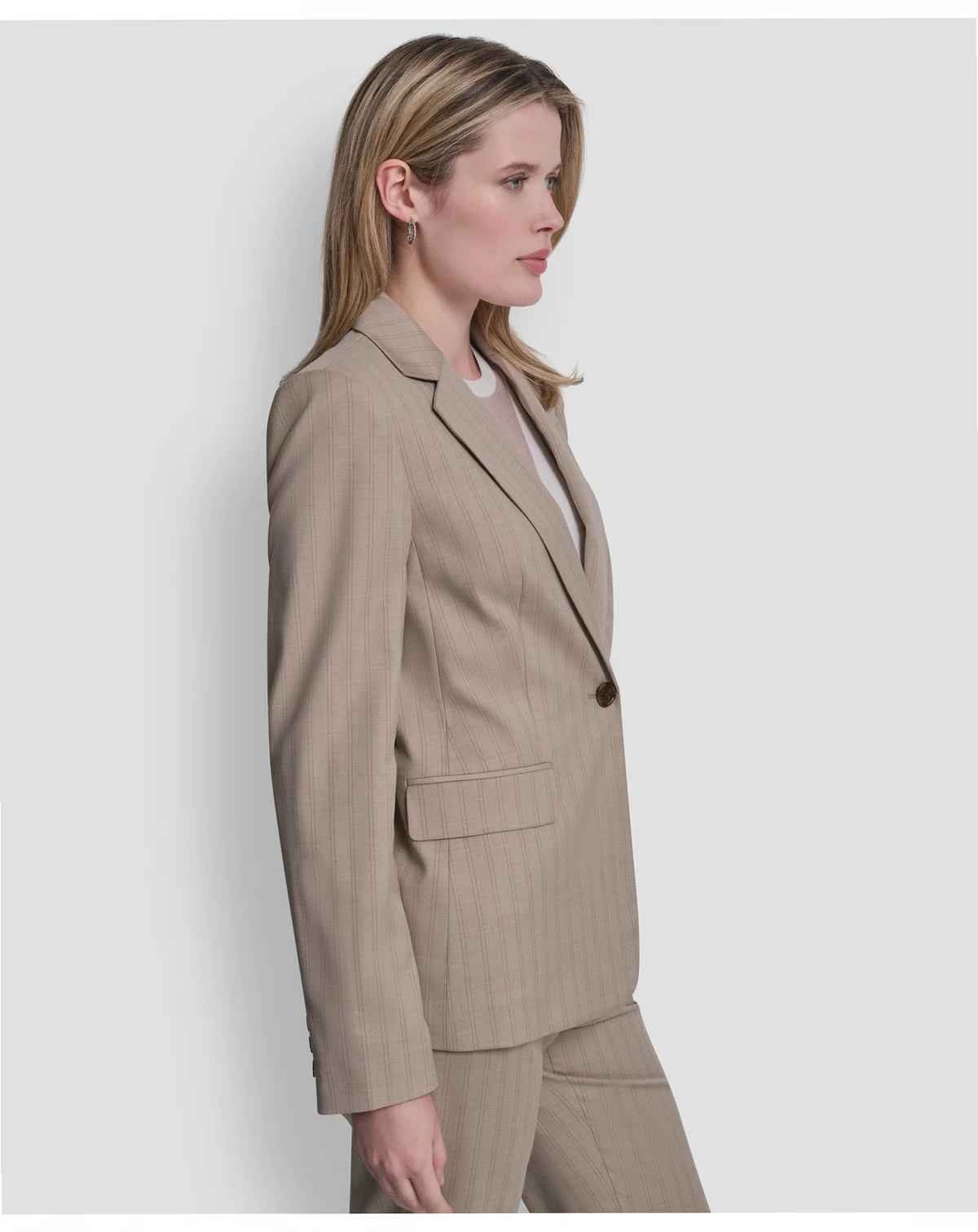 Command attention in a sleek pinstripe DKNY jacket, finished with a clean one-button closure and notch lapel. This blazer offers a sharp, structured look that transitions effortlessly from professional to polished casual settings.