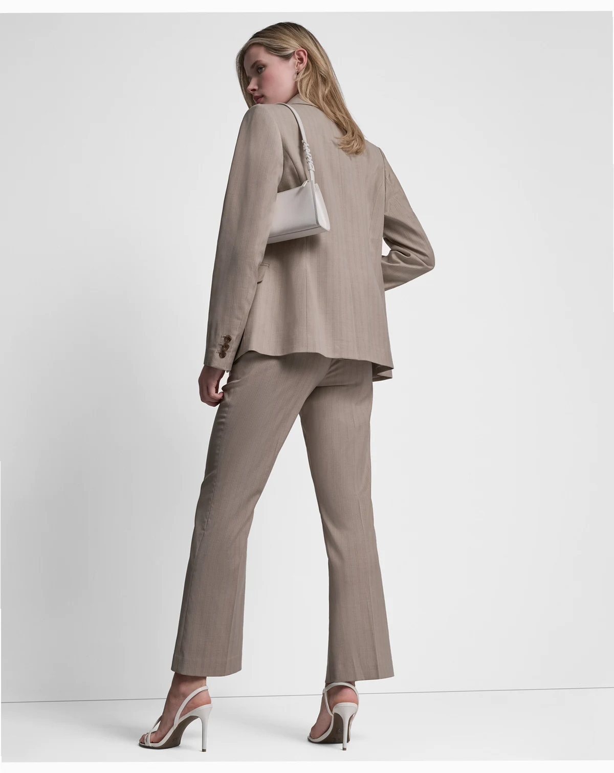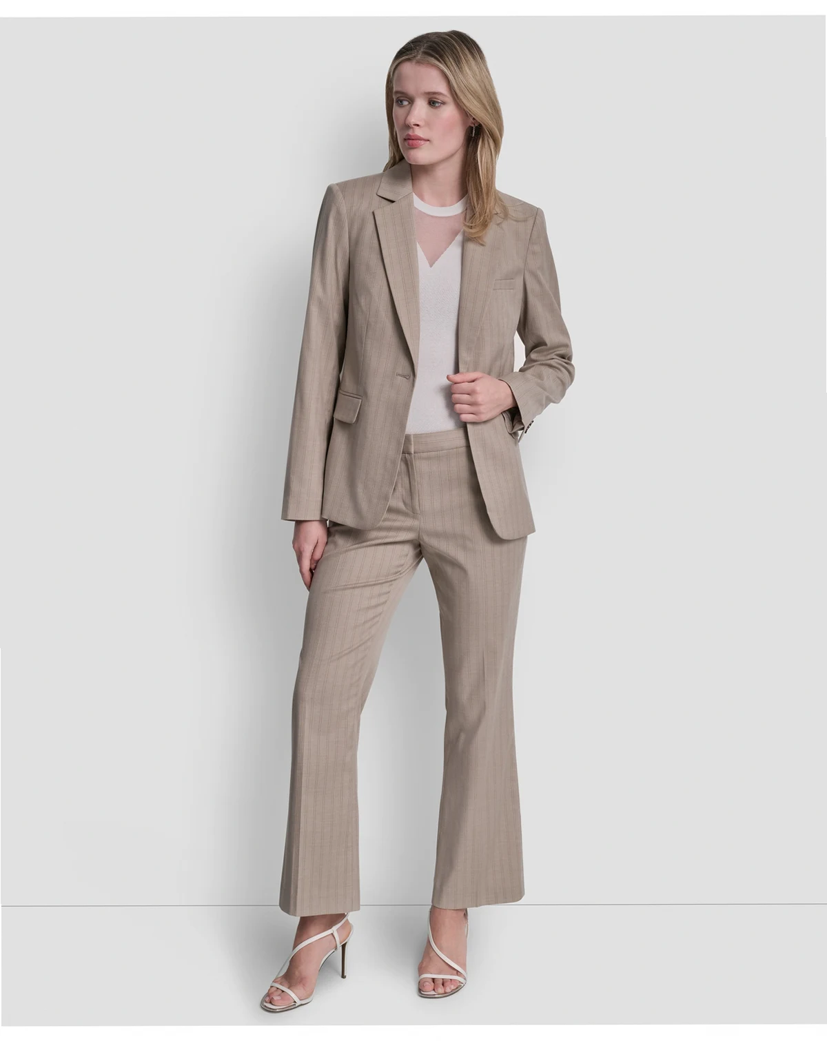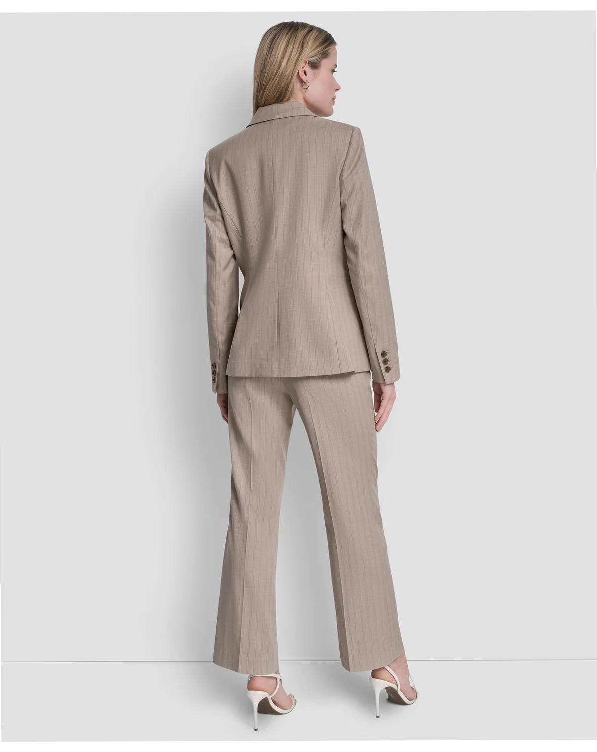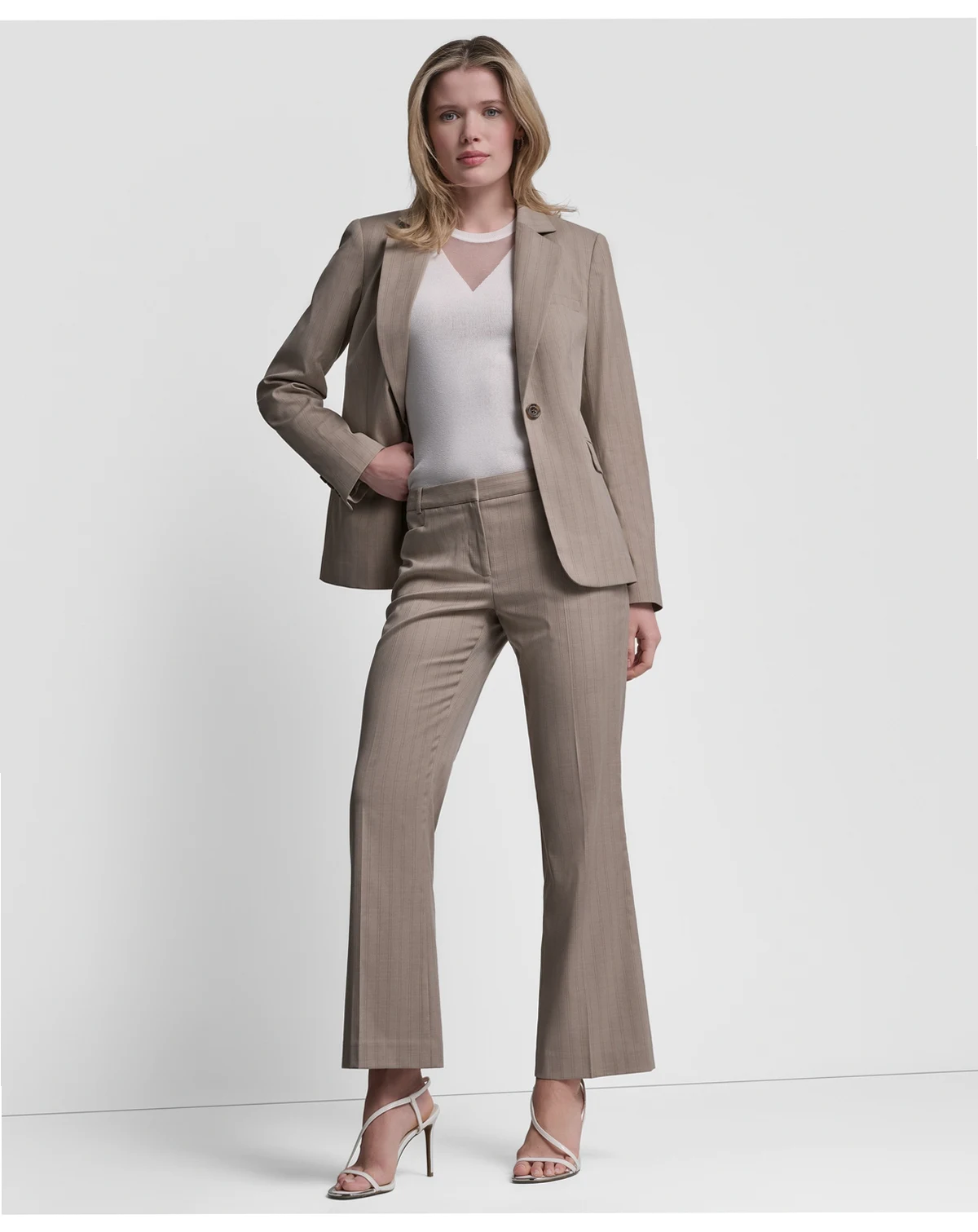 Command attention in a sleek pinstripe DKNY jacket, finished with a clean one-button closure and notch lapel. This blazer offers a sharp, structured look that transitions effortlessly from professional to polished casual settings.