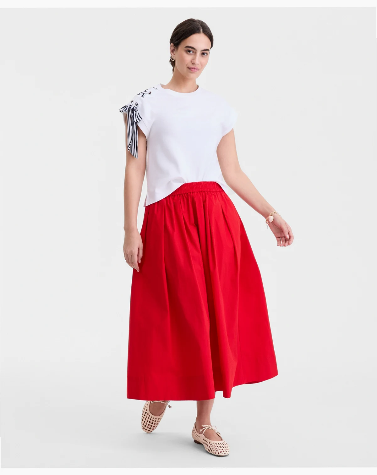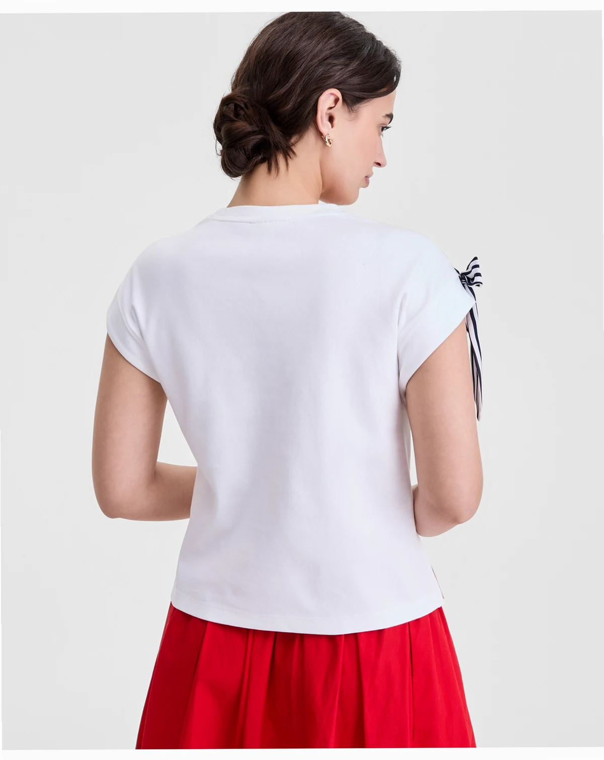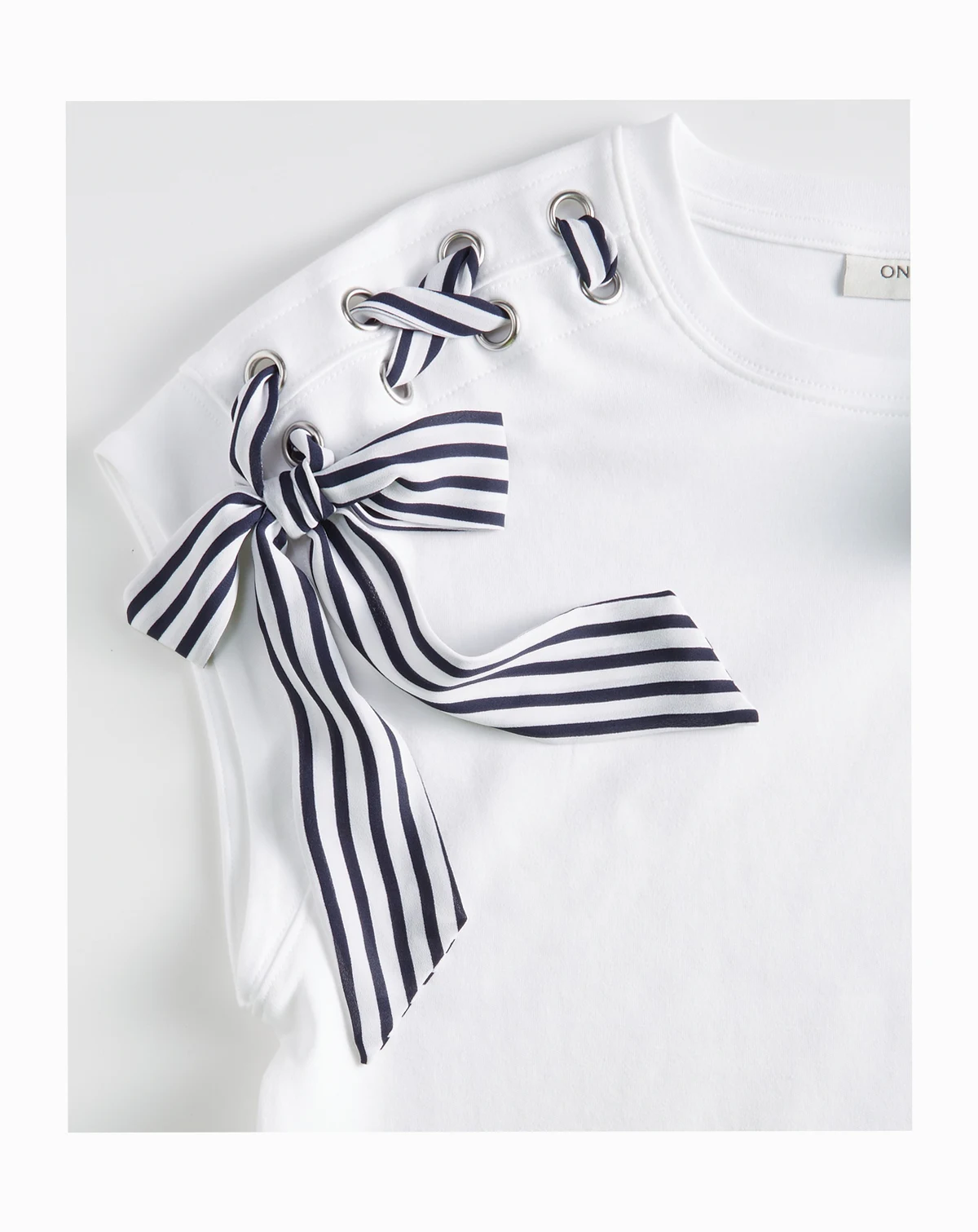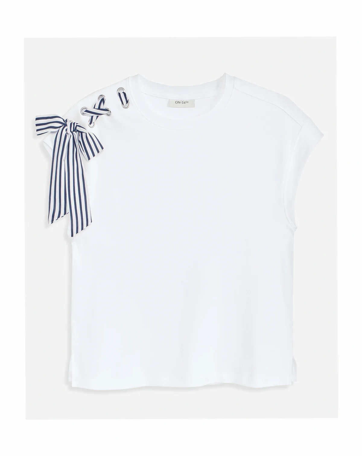 Grommets and striped ribbon laced up the shoulder lend a whole new look to our extended-shoulder muscle-style T-shirt. ABOUT THE BRAND: On 34th was designed for and with women like you. Made for your body, your style, and your truth. As your wardrobe's BFF, these mix-and-match pieces work with everything in your closet.