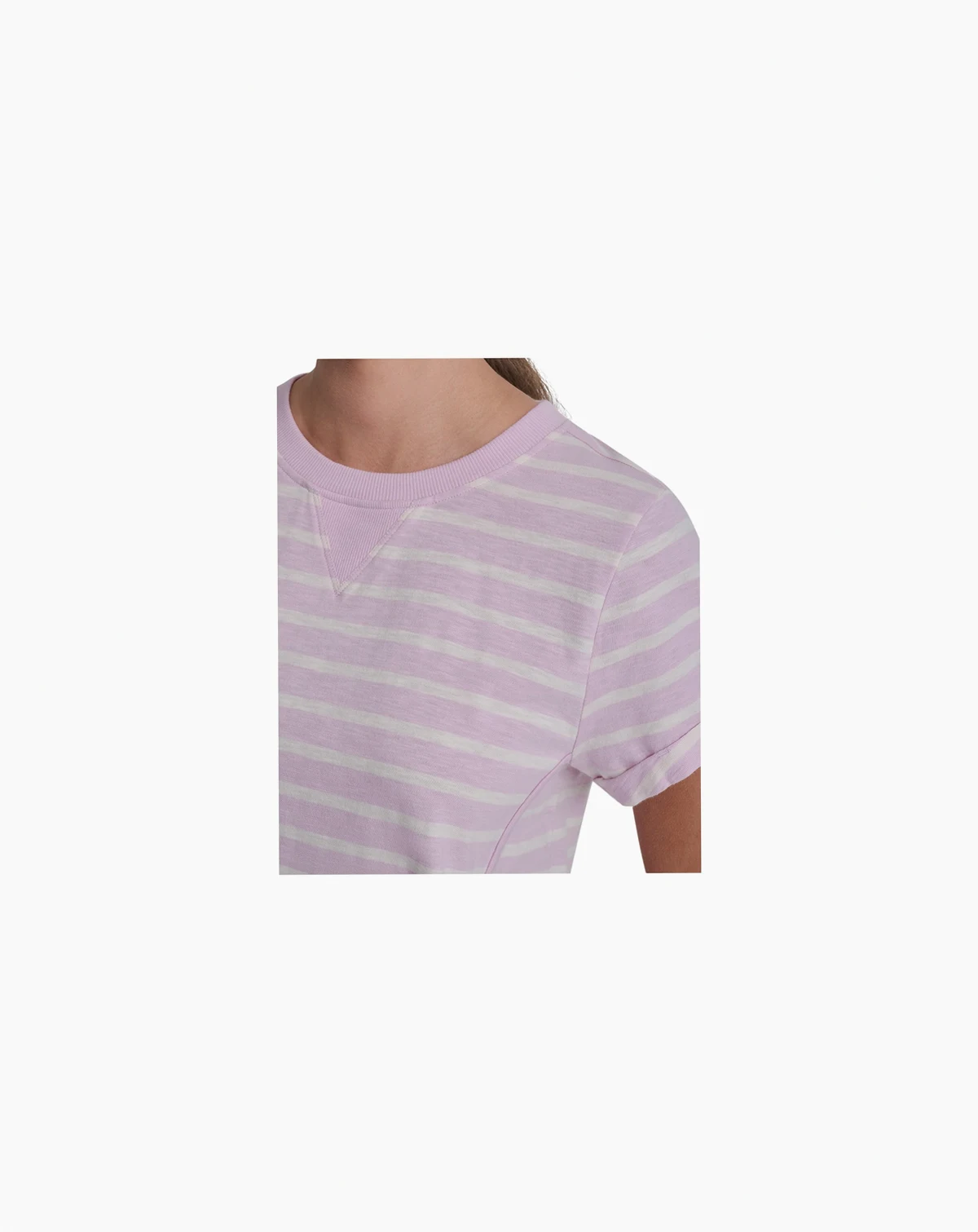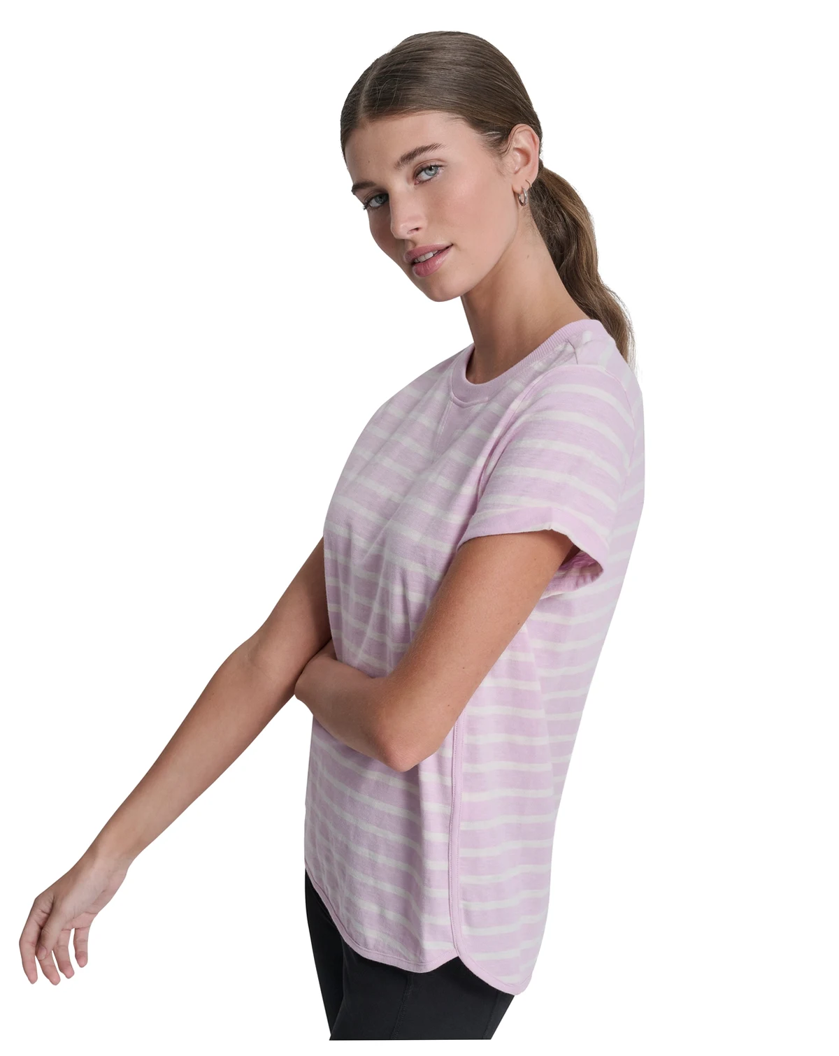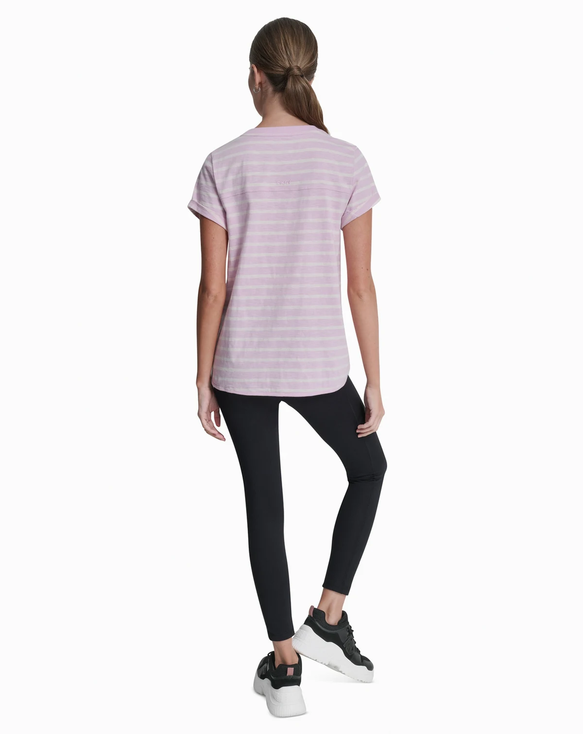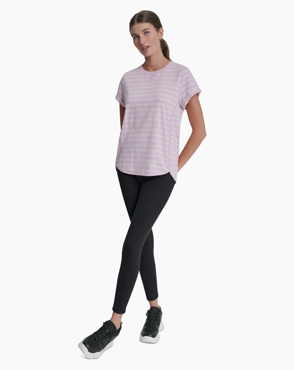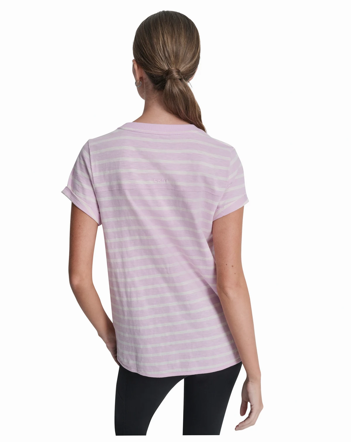 Blend sporty style with everyday comfort in this DKNY Sport top, designed with a regular fit and a classic crewneck. Short, rolled sleeves and a waist-length cut offer easy, versatile wear, while a V-inset adds a subtle design detail for a modern, polished finish.