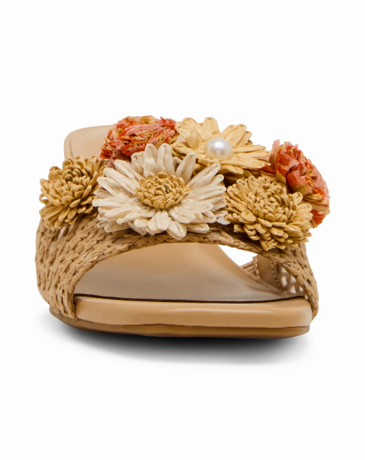 Woven raffia blooms with delicate florals, set atop a graceful block heel. A sandal that feels like sunshine captured in design.