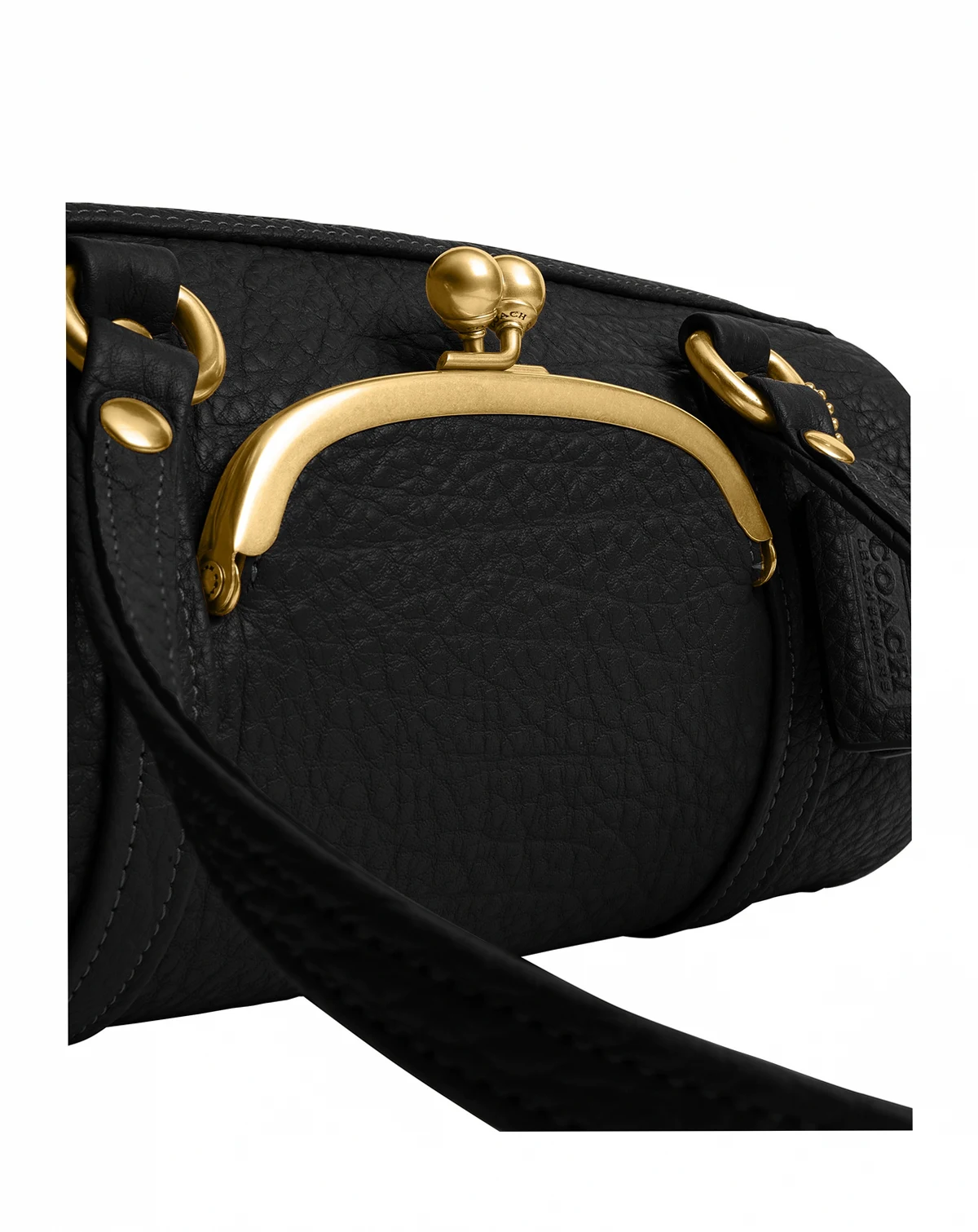 Elevate everyday style with this COACH Kiss-lock Barrel Bag, crafted from textured pebble leather for a refined, durable finish. Thoughtfully designed with a zip-top closure, exterior kiss-lock pocket, and interior snap pocket, it keeps essentials organized while looking chic.