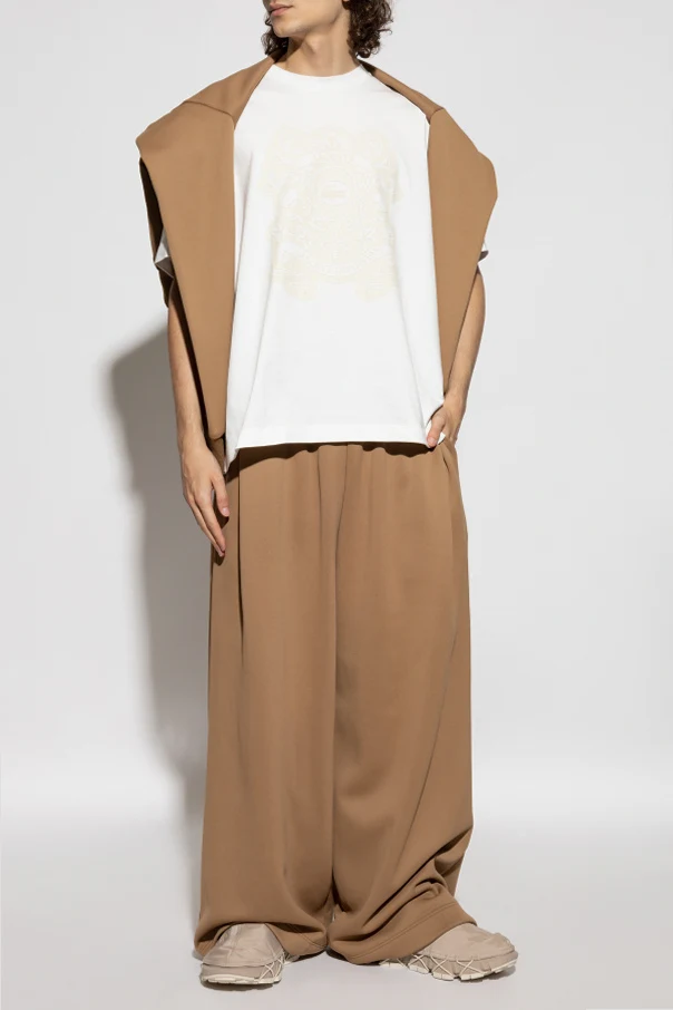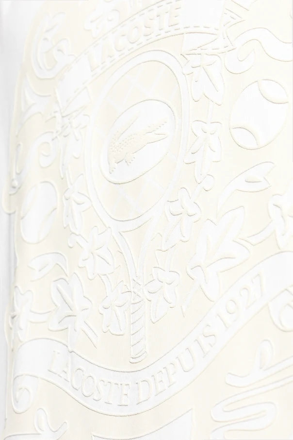 The front is adorned by an opulent, tonal print boasting an artfully stylized Tennis-inspired emblem. A central tennis racket, the brand’s iconic crocodile, and the inscription “LACOSTE DEPUIS 1927” evoke a prestigious sporting legacy, framed by intricate botanical motifs for a look both distinctive and inherently exclusive. Presented in an elegant cream hue, this T-shirt epitomizes understated luxury and unmistakable designer identity.