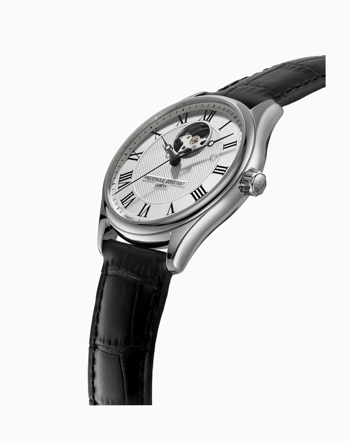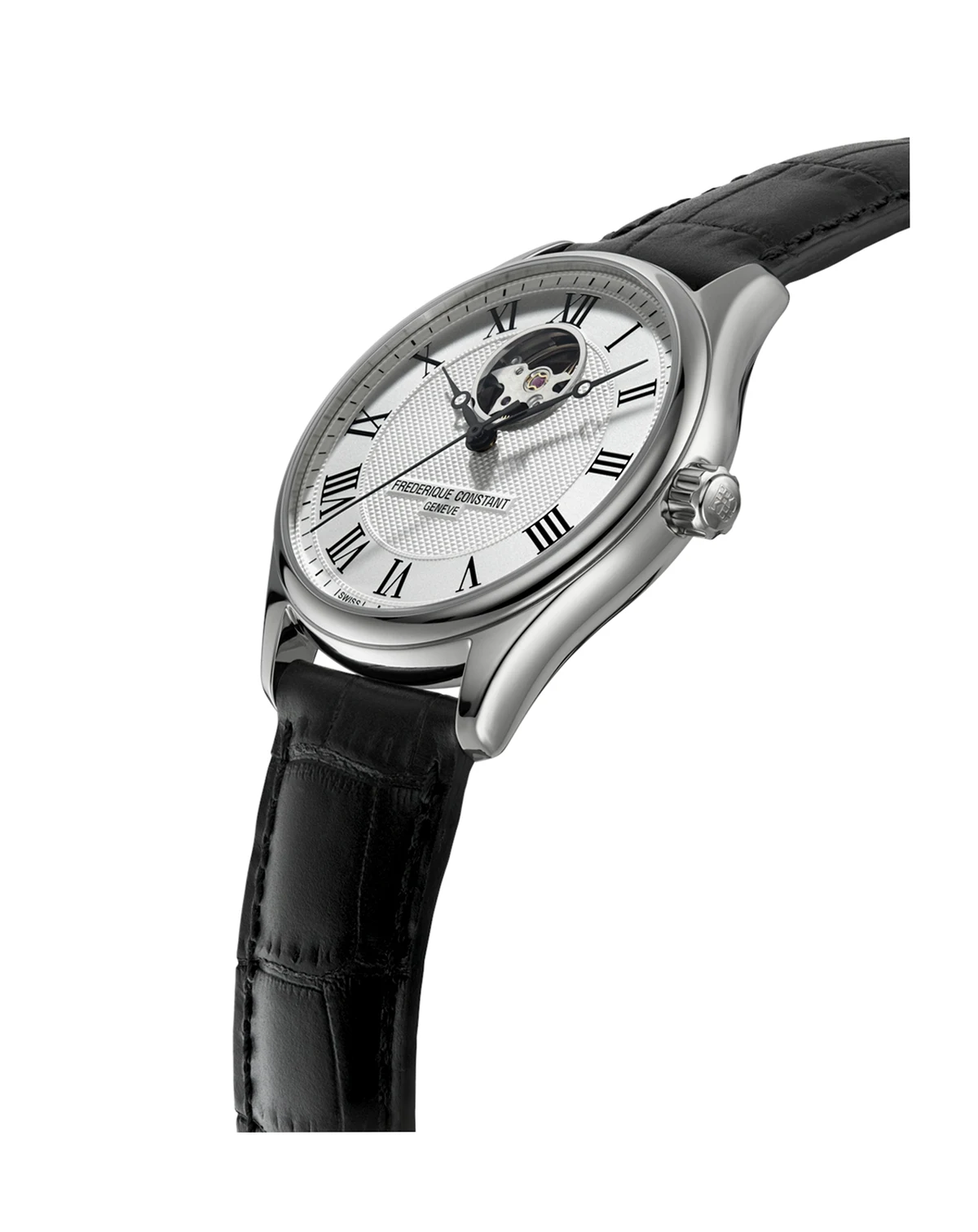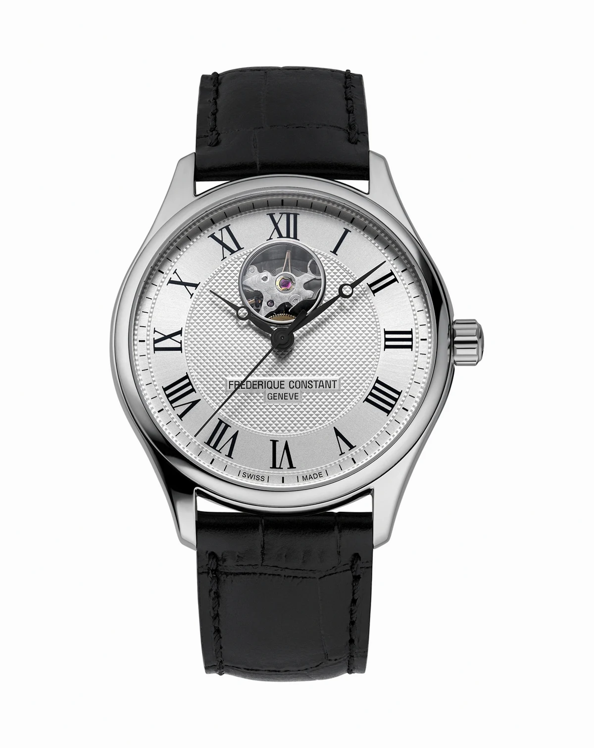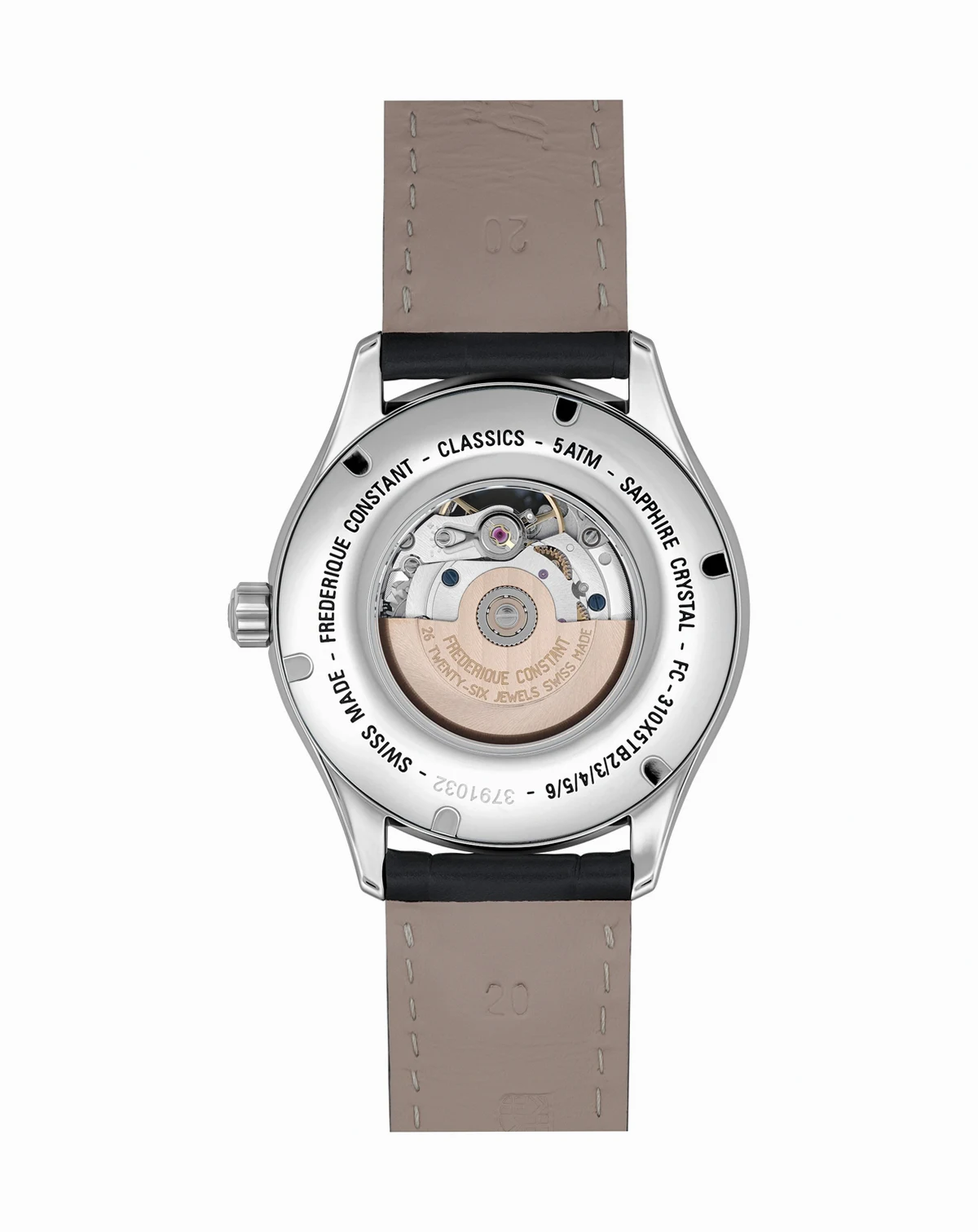 The Classics timepiece from Frederique Constant features groundbreaking automatic movement with an exposed aperture and see-through case back. Style #FC-310MC5B6