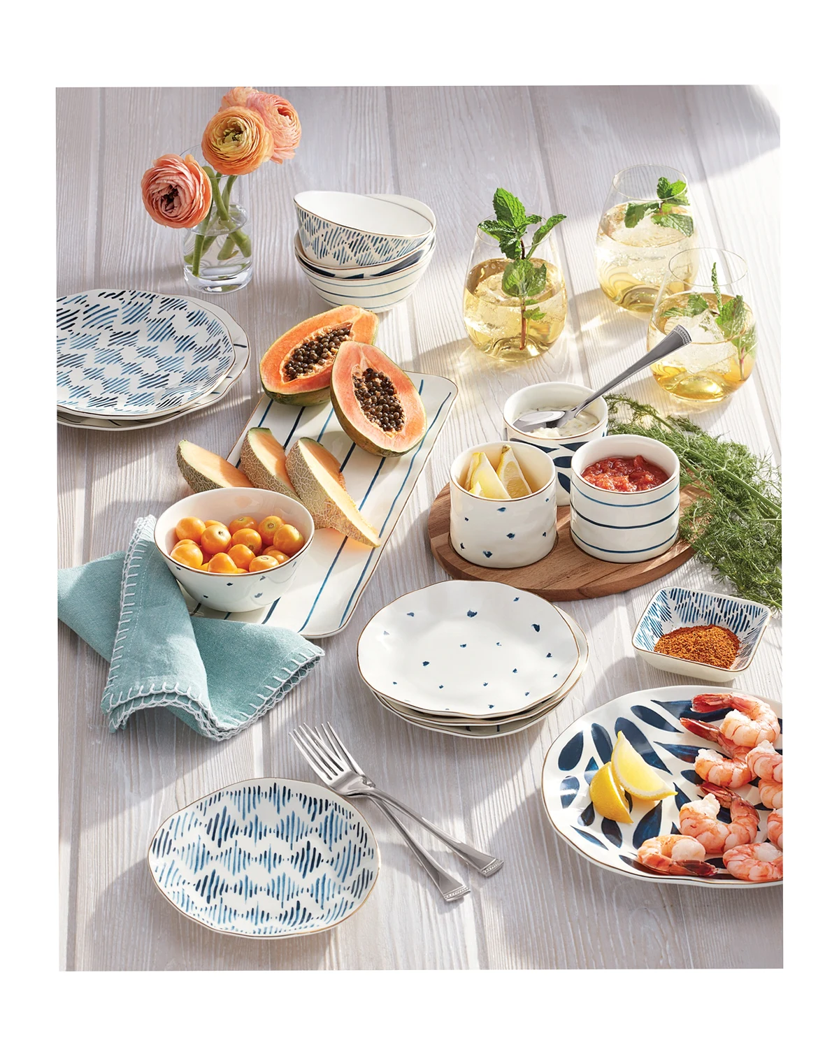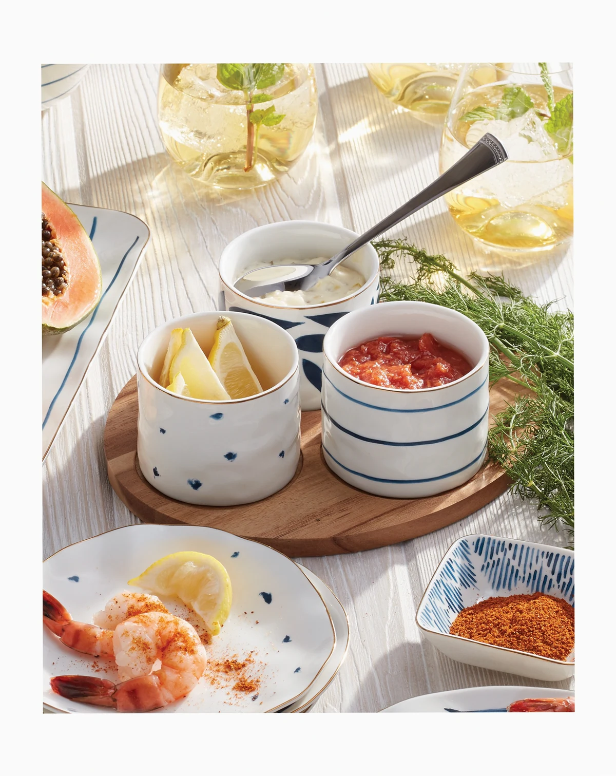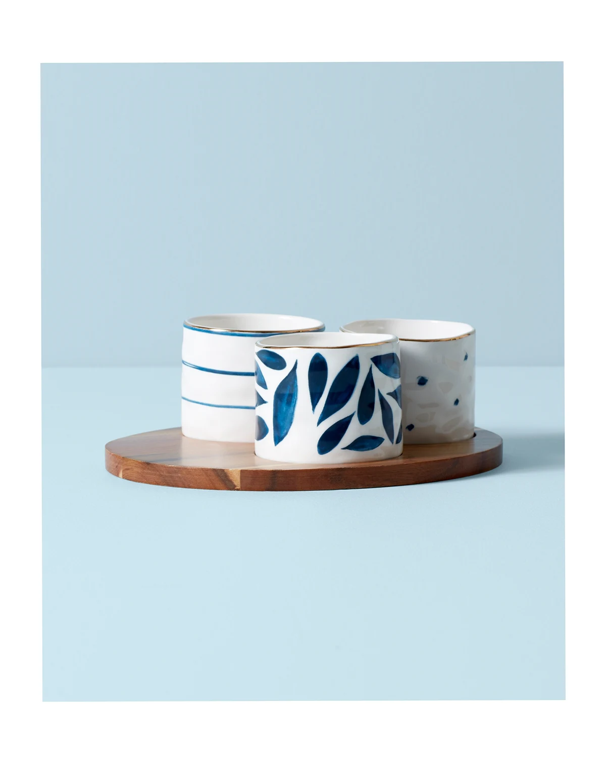 Blue Bay is a dessert story with a great hand-thrown pottery feel. This collection is made up of 4 whimsical, eclectic blue and white patterns that play perfectly together in assorted sets of four: Tid-bit plates, dessert plates, mugs, espresso cups/saucers, all-purpose bowls and dessert bowls. Layered in is a Teapot, sugar and creamer set and various trays to accommodate all of your entertaining needs. We incorporated wood for warmth and that artisan quality, plus a glimmer of microwave safe gold for everyday performance and presentation.