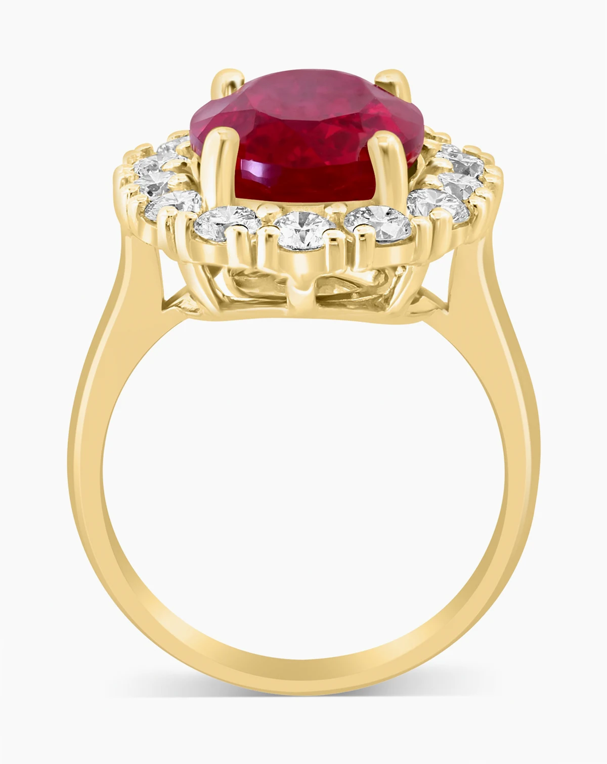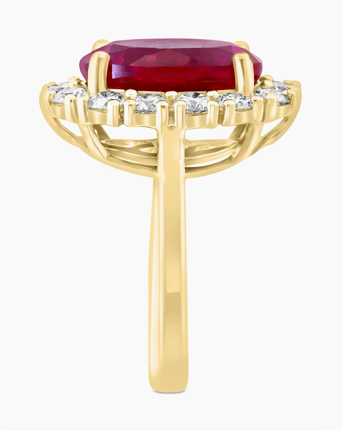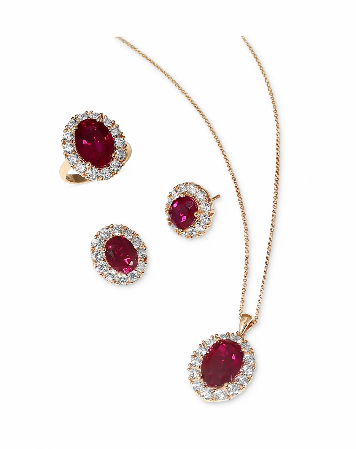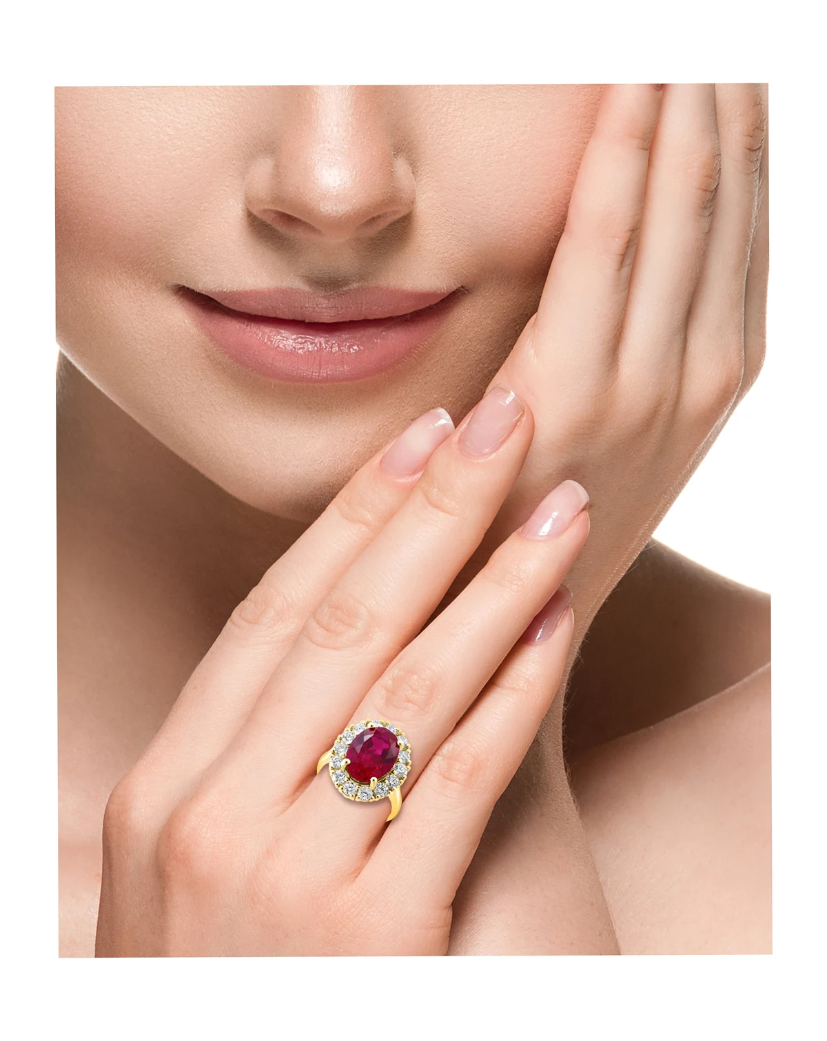 Immerse your style in the bold beautiful elegance of this oval-cut lab grown ruby and lab grown diamond halo ring from EFFY®.