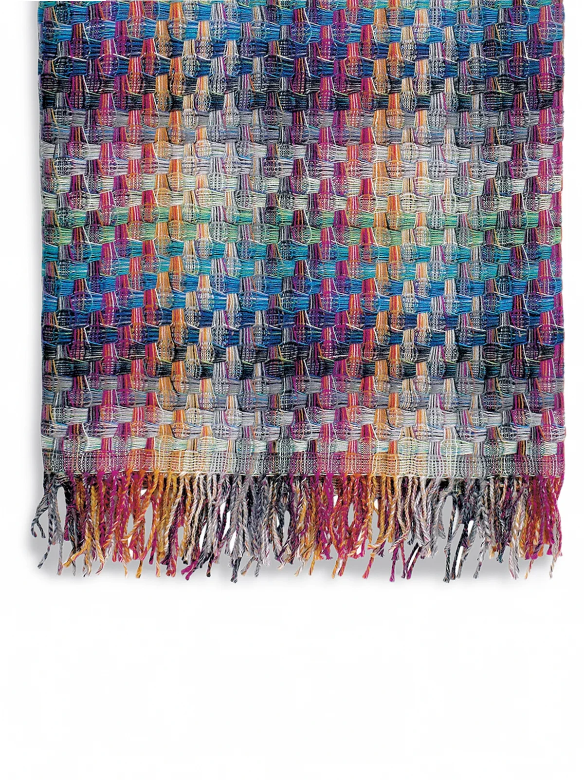 blue/multicolour wool knitted construction fringed edge 190cm x 130cm The item you receive may differ slightly from the item photographed. This is due to the artisanal nature in which all Missoni products are constructed.