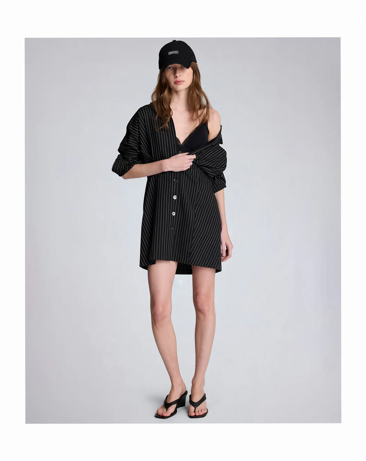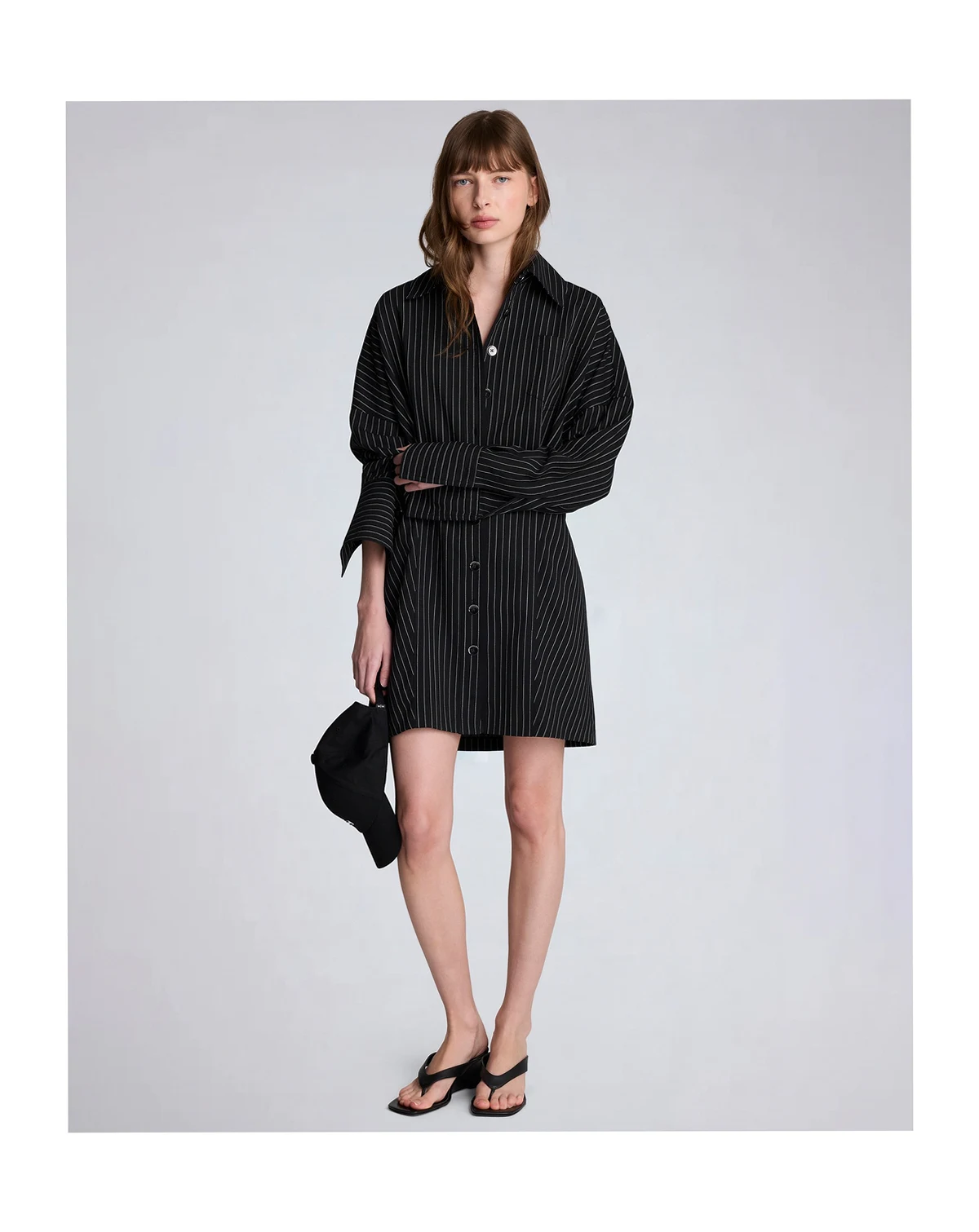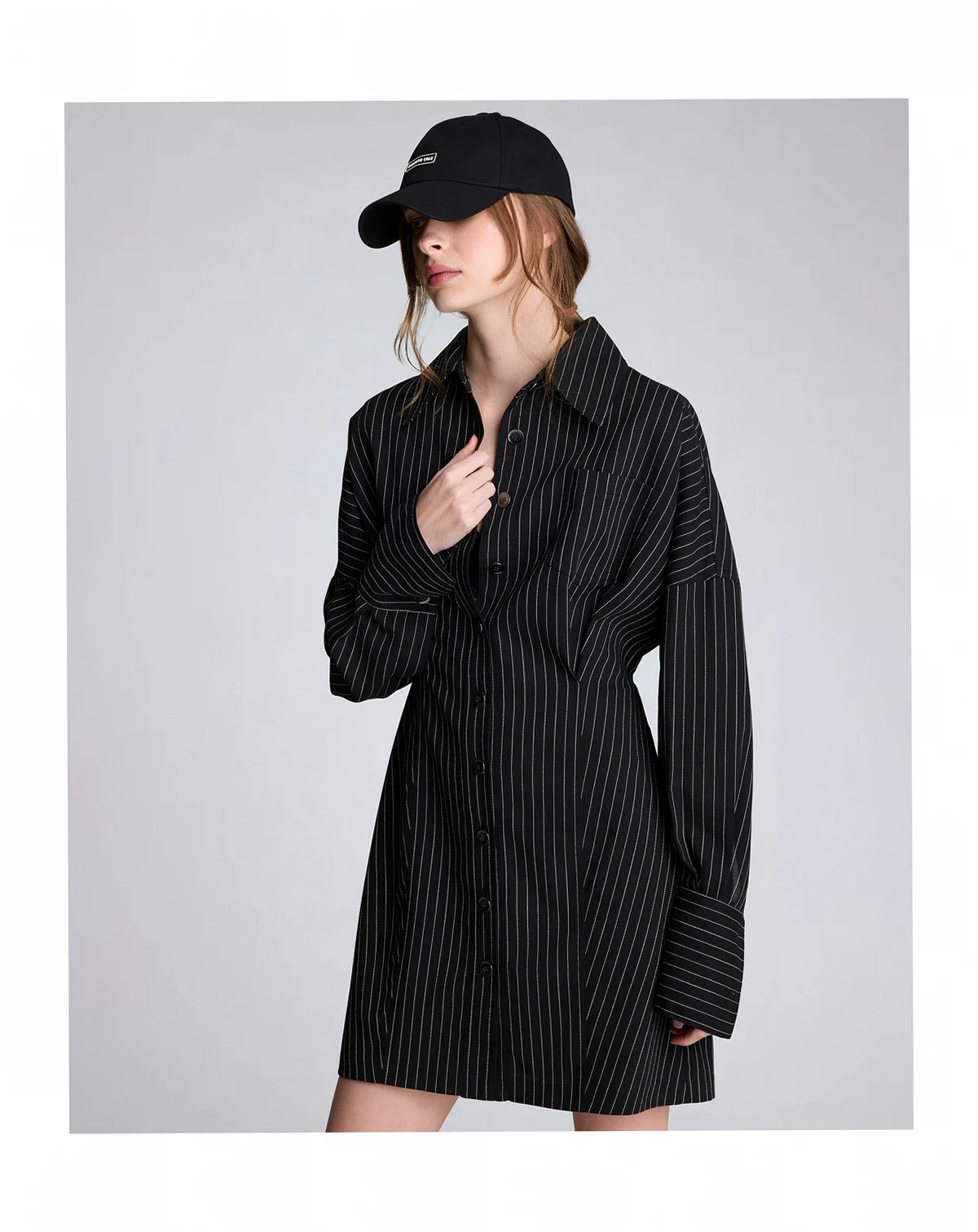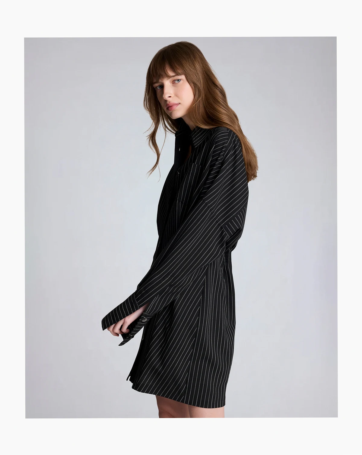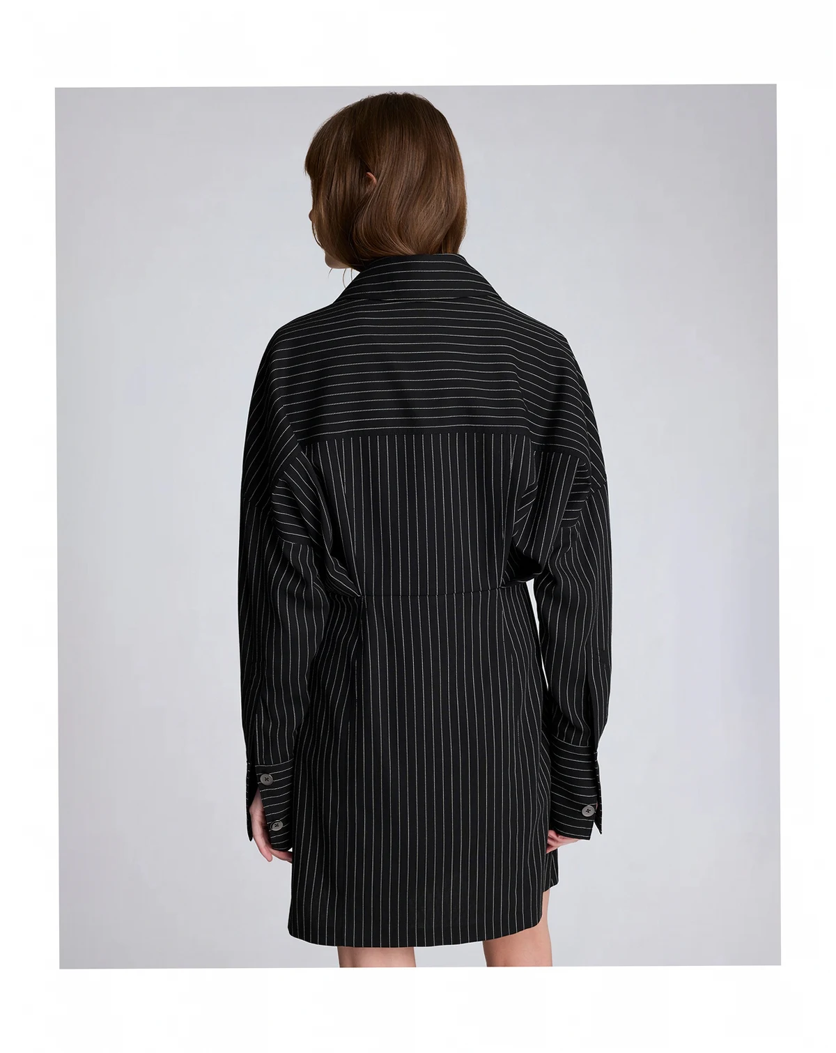 Merging shirtdress polish with a relaxed drop shoulder design, this Kenneth Cole piece features a pinstripe pattern and long sleeves. A button back closure and chest pocket add refined, functional details.