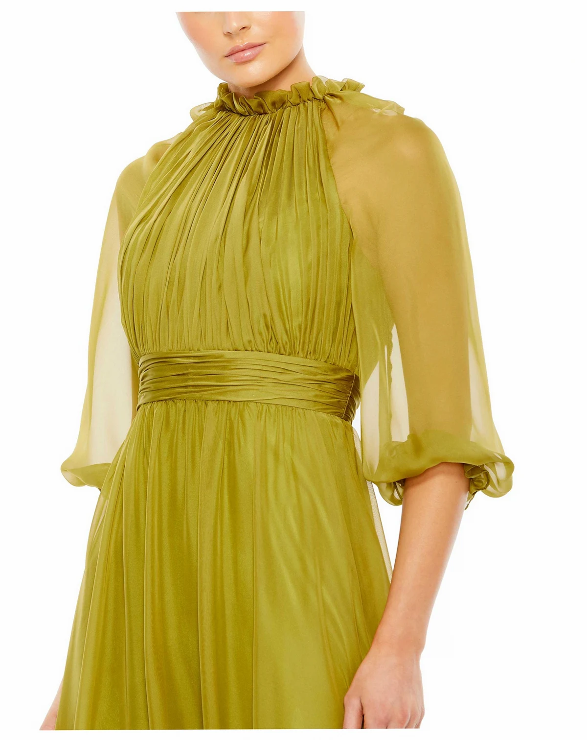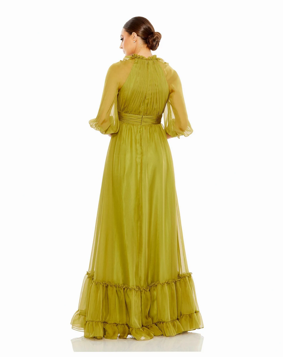 Exude elegance in this flowing evening gown designed with timeless sophistication. The high neckline and sheer three-quarter sleeves create a refined, graceful look, while delicate ruching at the bodice and waistband flatter the silhouette. A full-length skirt with tiered ruffle hemline adds movement and charm, making it perfect for weddings, galas, and formal occasions. With its balance of modesty and style, this gown is an ideal choice for anyone seeking effortless glamour.