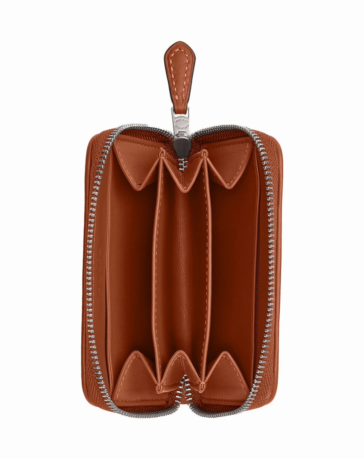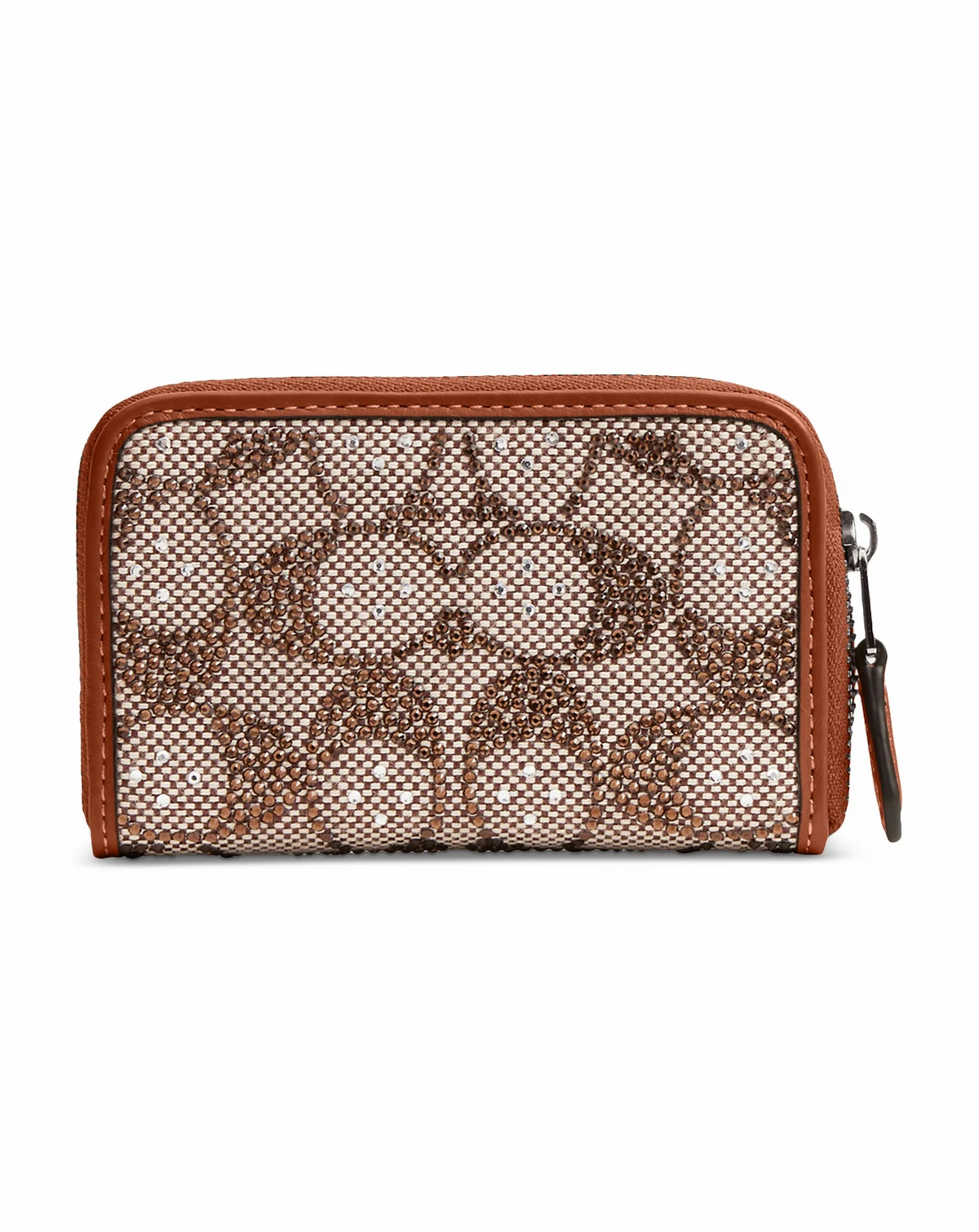 Crafted of glove tanned leather and our shimmery crystal-embellished Signature jacquard, this case holds cards, cash and other small essentials in a slim design that slips easily into pockets. The accordion gusseted style secures with a zip-around closure.