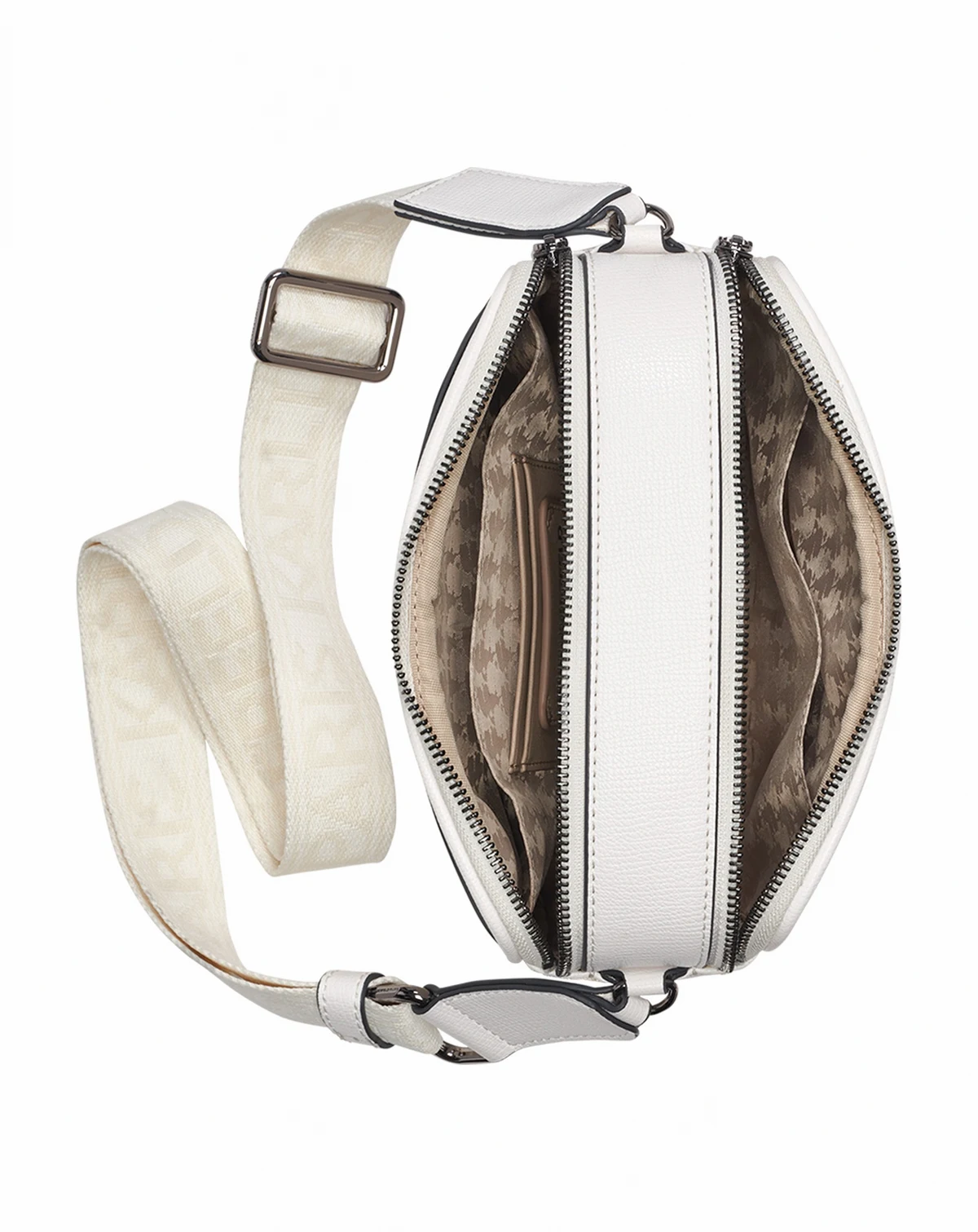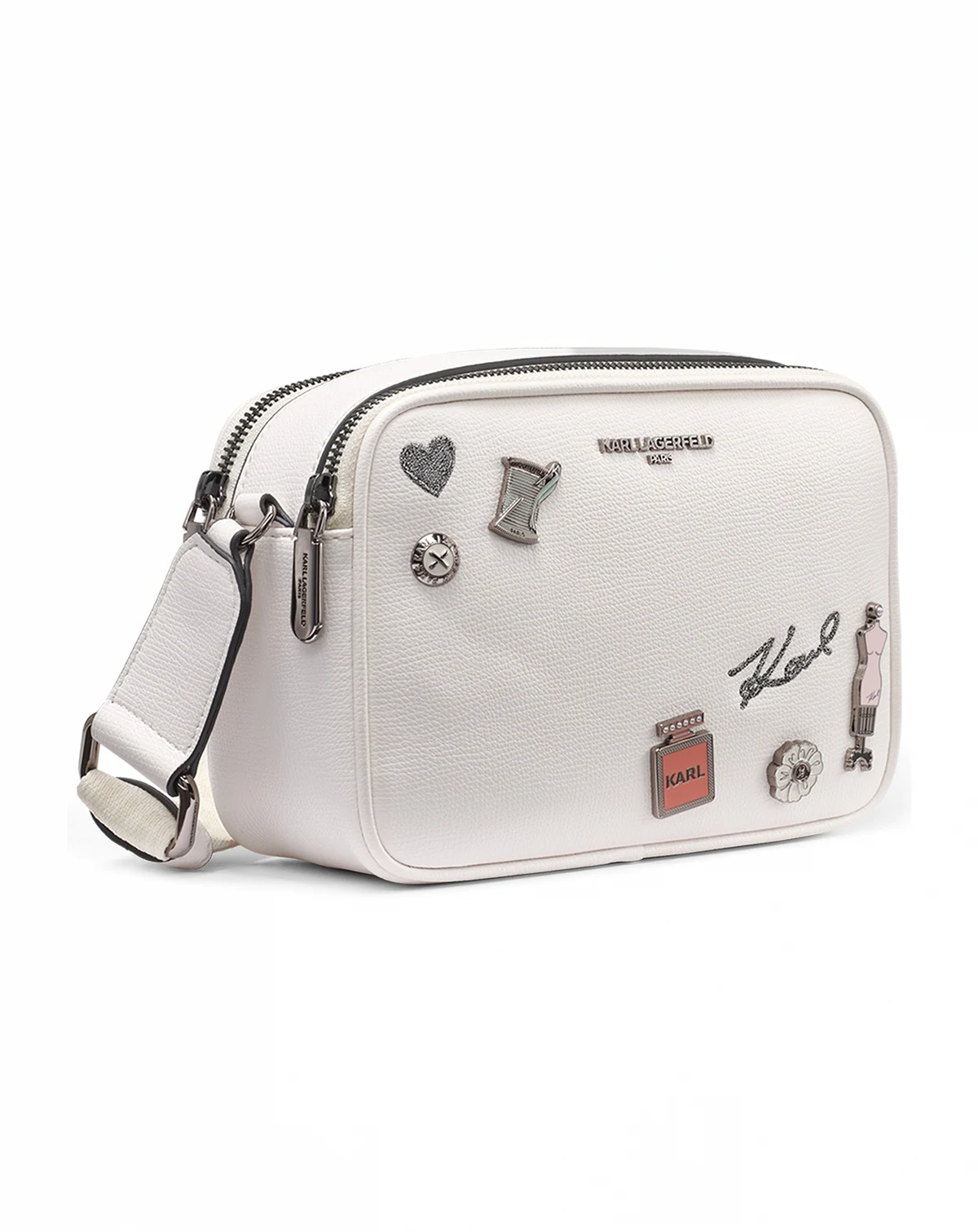 Zipping securely at the top, this KARL LAGERFELD PARIS Maybelle crossbody bag provides a compact, east-west shape for easy carry. Its construction includes handy card slots and a practical strap.