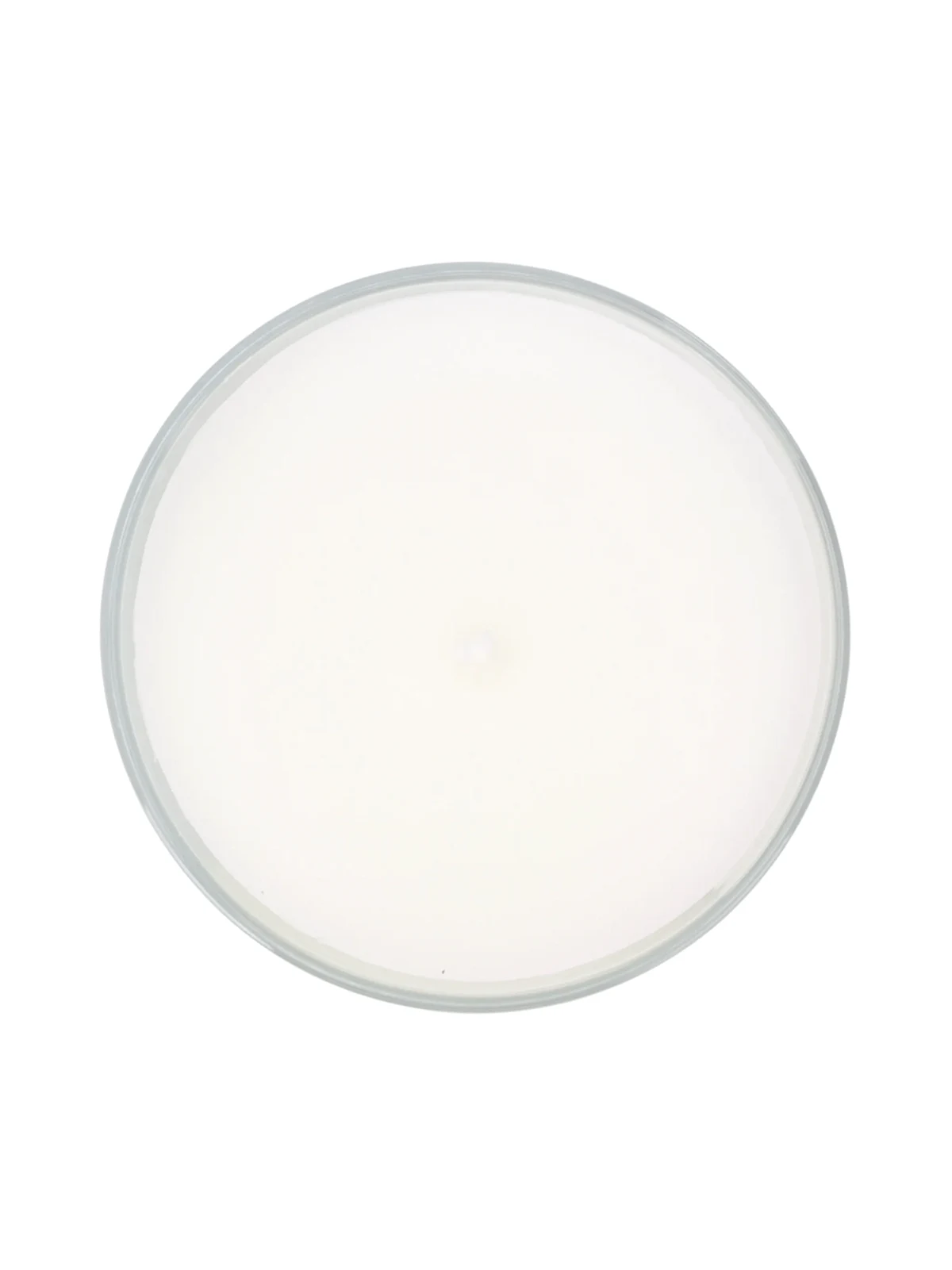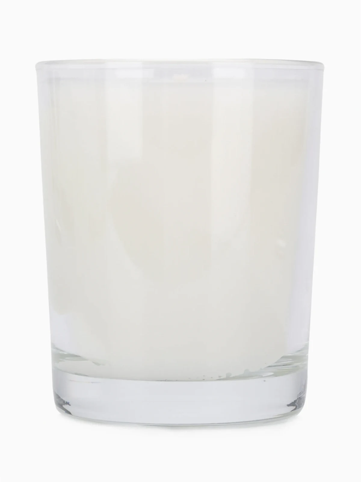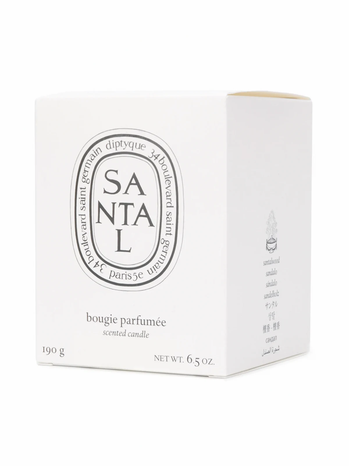 White wax Santal candle from Diptyque featuring a front centre logo stamp, notes of fresh-cut sandalwood, a cotton wicker and a glass jar.
