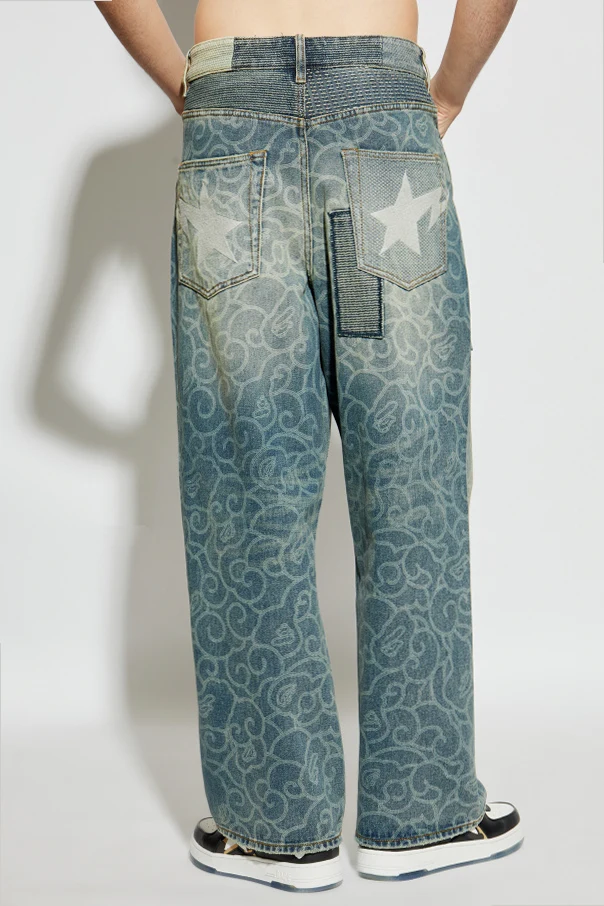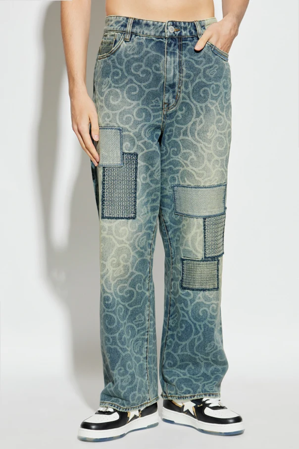The regular, relaxed fit and wide-leg silhouette blend comfort with timeless styling, while the all-over decorative pattern—bold, swirling lines—bestows this piece with a unique, expressive edge. Distinctive rectangular panels in dark-contrast denim are thoughtfully placed on both legs, introducing a dynamic interplay of texture and highlighting the intricate, multi-layered construction.