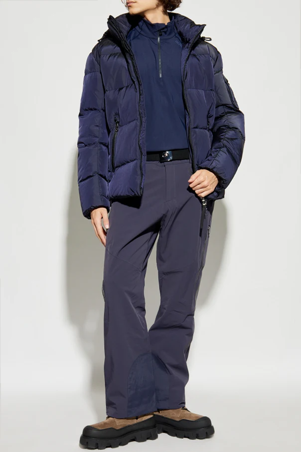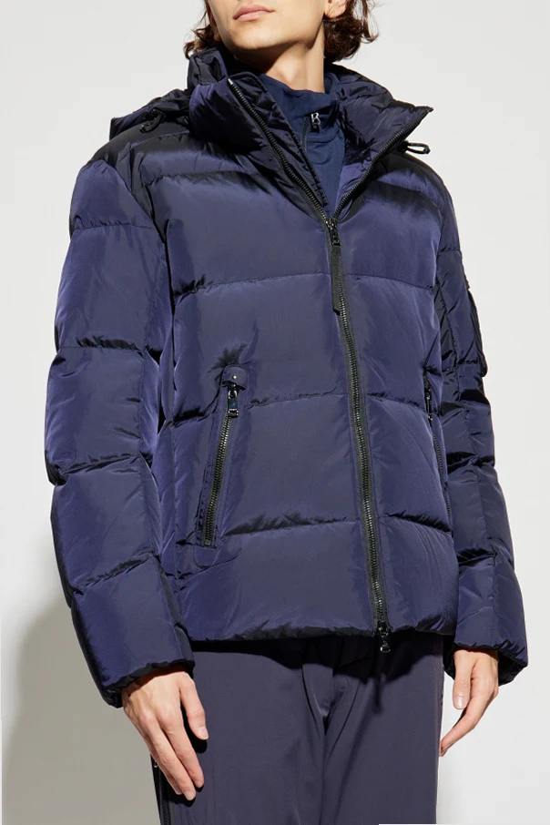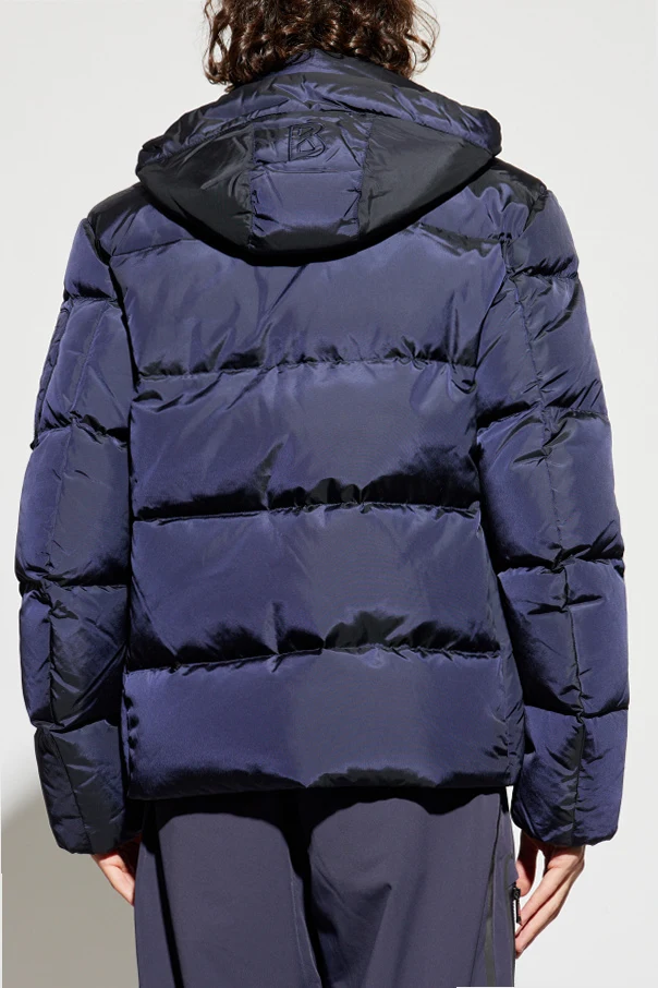 The Jamy Down Jacket by BOGNER embodies contemporary elegance, expertly crafted for the discerning gentleman. Presented in a sophisticated navy blue with subtle black accents on the shoulders and integrated hood, this piece radiates refined style. Its classic, regular-fit puffer silhouette is accentuated by pronounced horizontal baffles, which not only distinguish its design but also optimize insulation.