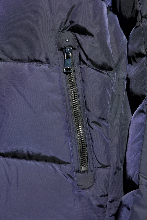 Constructed from a lustrous synthetic fabric and filled with premium duck down, the jacket promises both luxurious warmth and enduring durability. Features such as a full-length, dual-direction zipper, expertly reinforced zippered side pockets, and an additional utility pocket on the left sleeve, underscore its functional sophistication.