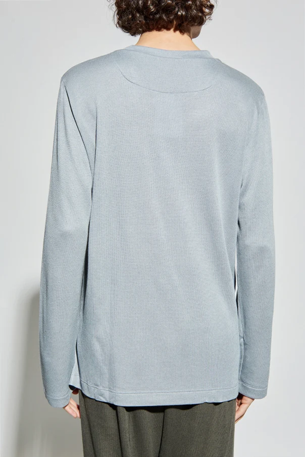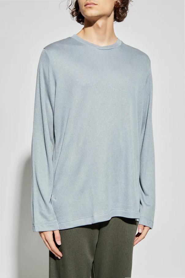 Experience understated luxury with the Hanro Long Sleeve Undershirt, rendered in a sophisticated blue hue. Crafted from a refined blend of modal and wool, this T-shirt boasts a noticeably fine, textured weave that ensures breathability and supreme comfort. Its classic, relaxed silhouette features clean lines, smooth long sleeves, and a minimalist, pattern-free design, epitomizing timeless elegance. Discreet side slits at the hem enhance freedom of movement and accentuate the shirt's elevated simplicity. Free from any visible logos or embellishments, this piece embodies Hanro’s renowned commitment to exceptional quality and modern sophistication since 1884.