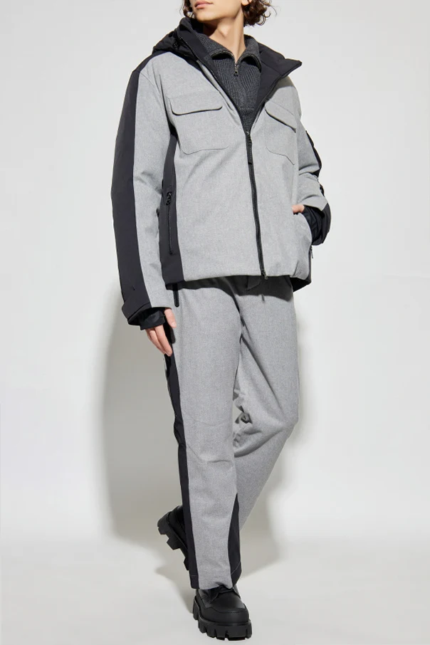 The Cobeyn Down Ski Jacket from BOGNER embodies refined alpine sophistication. Crafted from an exclusive blend of wool, elastane, polyamide, and polyester, its exterior exudes a technical, subtly matte finish, balanced by the plush warmth of a premium down filling. The harmonious interplay of cool gray and striking black panels—accenting the sleeves, sides, back, and hood—creates a timeless, yet boldly modern aesthetic.