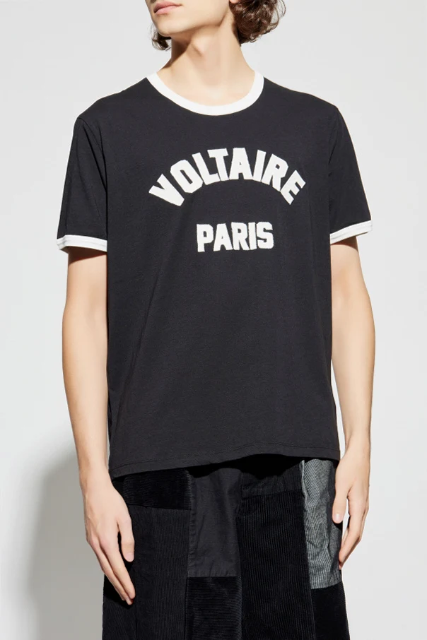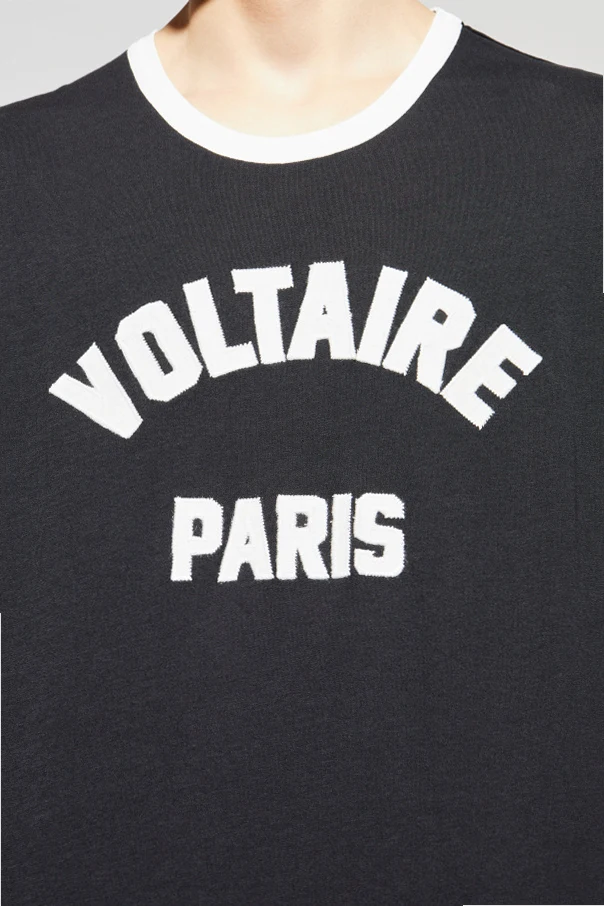 Distinctive details, such as the contrasting white trim at the crew neckline and sleeve edges, elegantly accentuate the minimalist black canvas. The bold, white VOLTAIRE arched print and straight PARIS lettering on the front serve as unmistakable emblems of the brand’s storied heritage and contemporary vision.