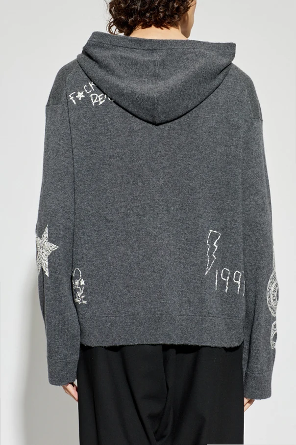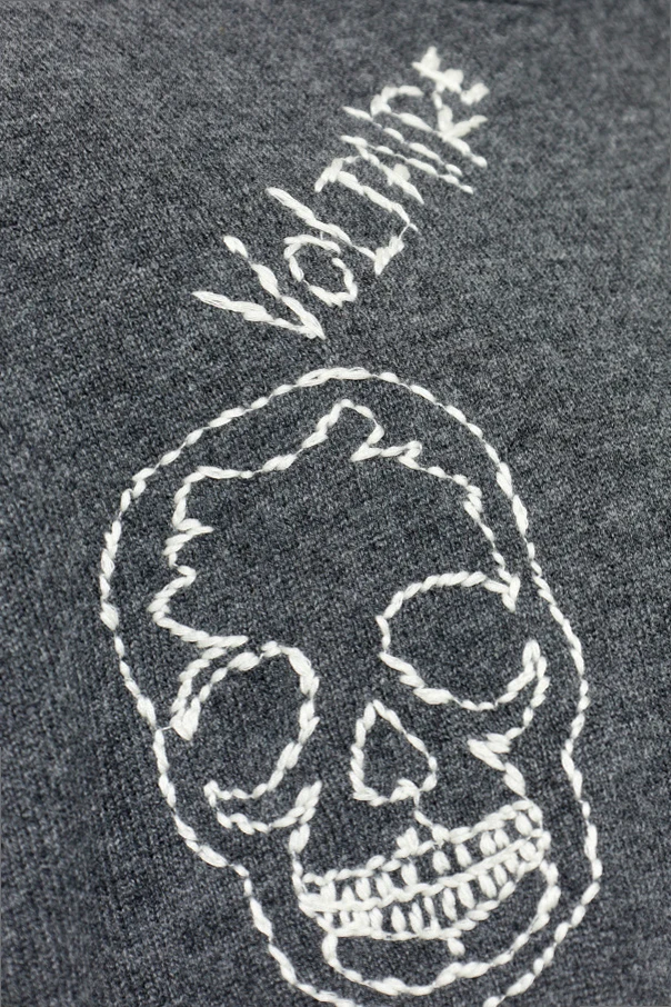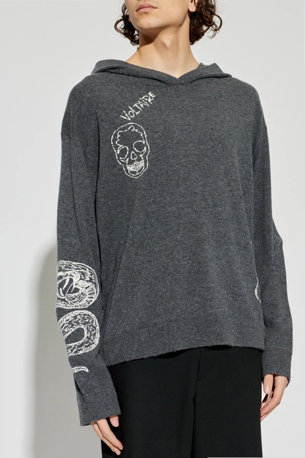 Its relaxed silhouette, complete with elongated sleeves, a gently dropped shoulder, standard length, and a pronounced hood, offers elevated comfort without compromising an effortlessly polished look. Distinguished white embroidery adorns the design: a bold skull and "Voltaire" script at the front, sinuous dragonlike motifs trailing along the sleeves, and intricate accents—stars, a lightning bolt, stylized figures, and dynamic numbers—at the back, all suggestive of artisanal, hand-stitched detail.