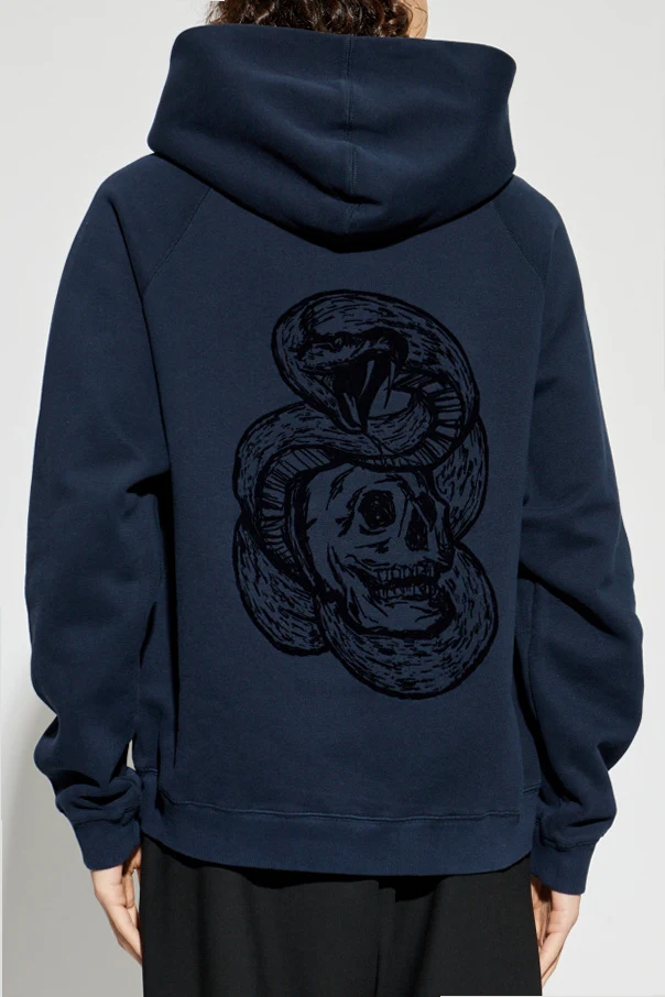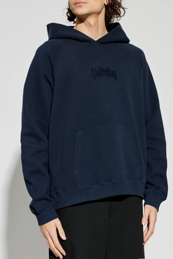 Impeccably minimalist, the hoodie features a striking black embroidered "Voltaire" signature at the chest, subtly affirming its designer provenance. The pièce de résistance graces the back—a bold, intricately embroidered skull entwined by a serpent, both artful and daring, celebrating the brand’s iconic aesthetic.
