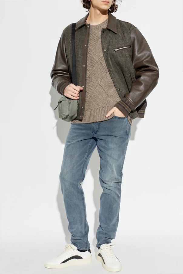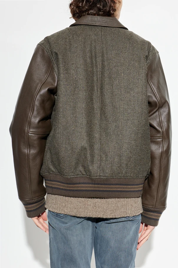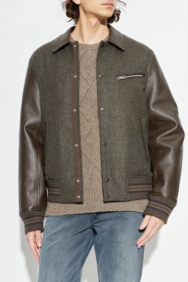 Exuding refined sophistication, this wool varsity jacket by Rag & Bone seamlessly blends classic style with contemporary flair. The body features premium wool adorned with a subtle houndstooth check, imparting a sense of heritage charm. Contrasting, smooth brown cowhide leather sleeves, collar, and trims elevate the aesthetic, creating a harmonious interplay of rich textures.