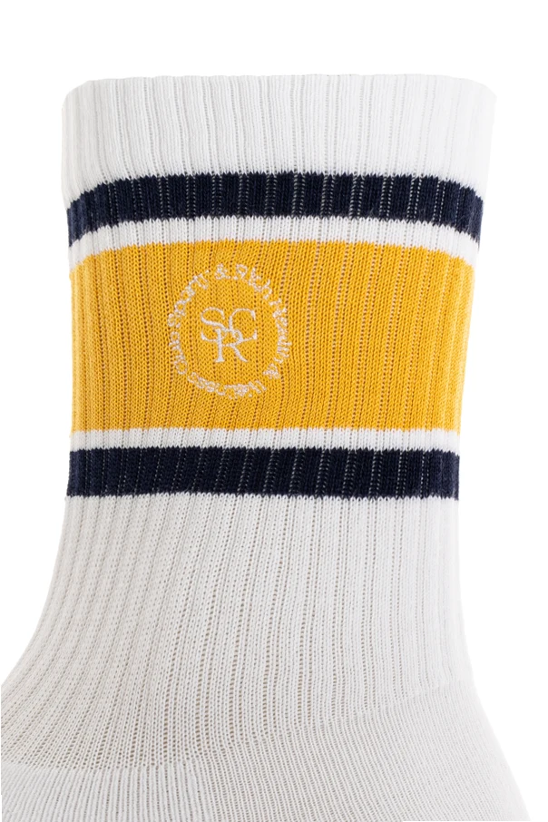 The crisp white base is elegantly punctuated by a wide, vibrant yellow band at the calf, flanked by two deep navy stripes for a refined, athletic touch. The distinctive circular logo set within the yellow band—tastefully rendered in white—confirms the sock’s discerning pedigree without overwhelming its minimalist design.