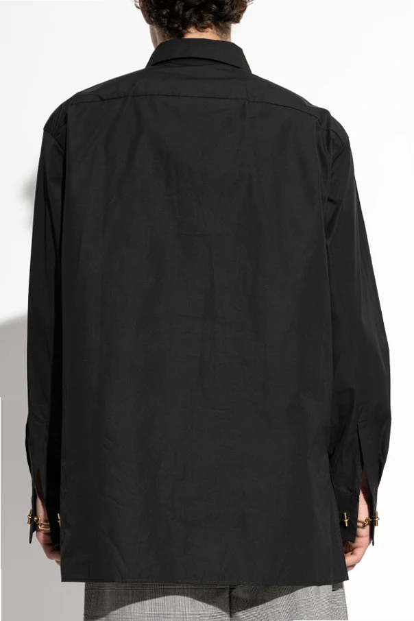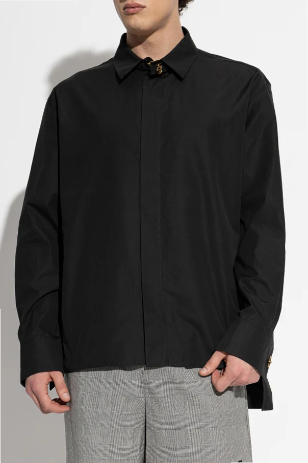 Artfully concealed button closures preserve a sleek, minimalist front, allowing the uniquely styled metallic fastenings at the collar and cuffs to command the spotlight. Each detail showcases Balmain’s dedication to understated luxury and exclusivity, making this shirt a truly singular addition to any discerning wardrobe.
