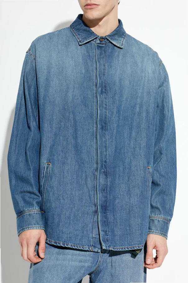 The silhouette is gently oversized, boasting a straight cut with a rounded hem for effortless movement and a distinguished shape. Subtle yellow-brown contrast stitching elegantly frames the seams, highlighting the shirt's exquisite tailoring. The concealed button placket and modern, slant-set side pockets infuse a contemporary spirit, while cuffed sleeves and a timeless collar complete this exceptional piece.