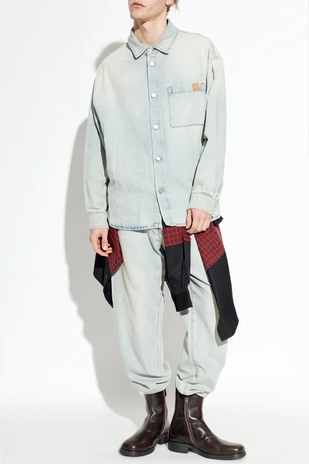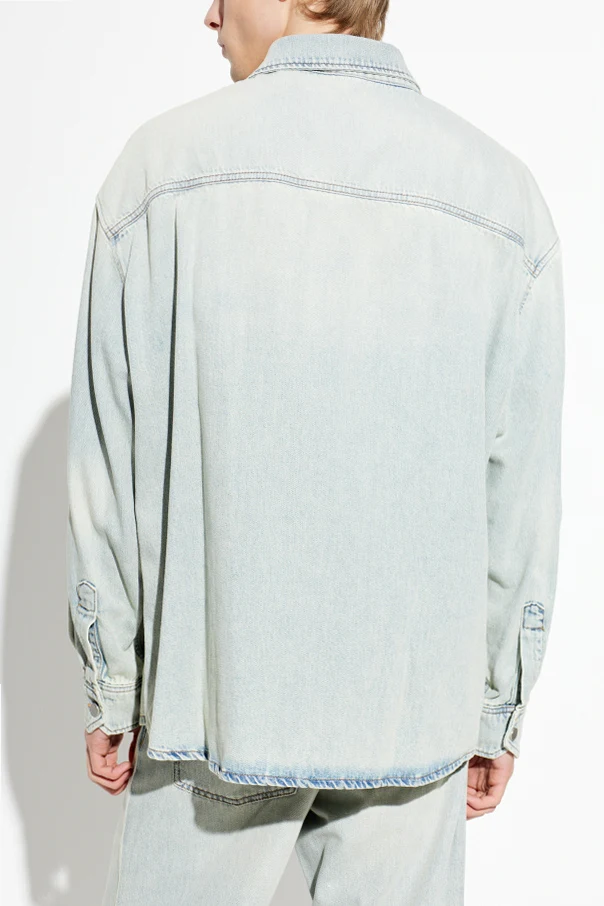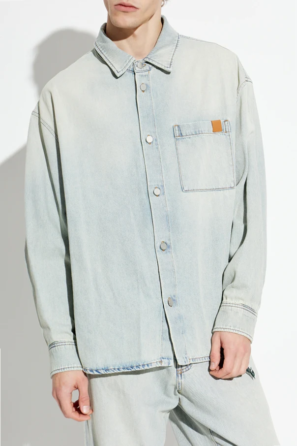Its light blue hue is artfully accented by subtle fading and a natural washed effect, evoking timeless appeal. The classic straight silhouette, complete with long sleeves, a simple collar, and a singular chest pocket, offers understated elegance. A signature touch, the chest pocket is adorned with a discreet brown eco-leather patch bearing the DARKPARK logo, subtly distinguishing this design. Metal buttons throughout the front and at the cuffs enhance the shirt's enduring yet contemporary character.