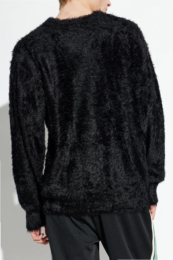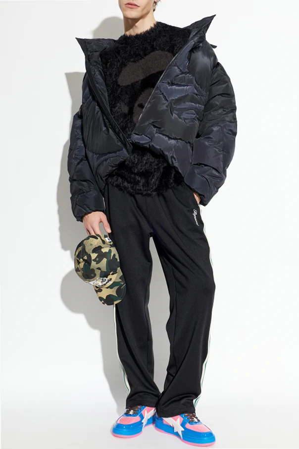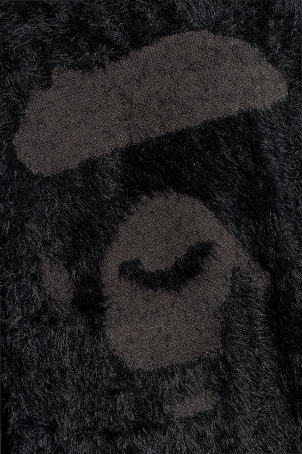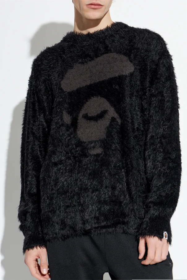Experience refined sophistication with this black crew neck sweater by A BATHING APE® . Meticulously crafted from plush, soft-knit fabric reminiscent of luxurious faux fur, this piece delights with its distinct tactile allure and chic modernity. The classic regular fit and long sleeves offer timeless appeal, while the striking front showcases a bold, dark gray pop-art face motif—an unmistakable emblem of the designer’s esteemed collection.