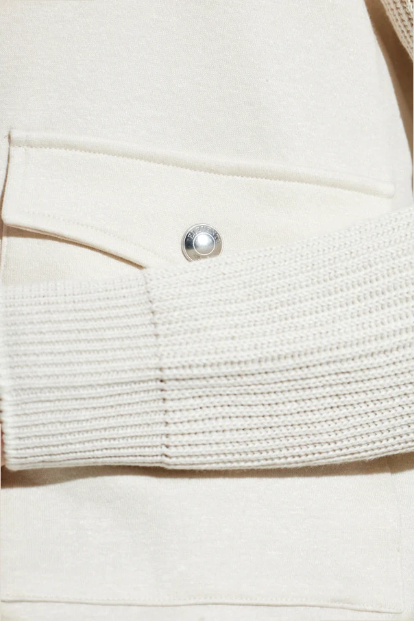 Signature details include a sleek, full-length metal zipper and two front flap pockets that close securely with polished metal snaps—striking a balance between utility and decorative appeal. Gently geometric, these pockets add a distinctive architectural edge. Finely knit ribbed trims at the cuffs and hem complete the silhouette, ensuring an impeccable fit and sculpted finish.