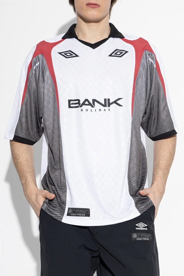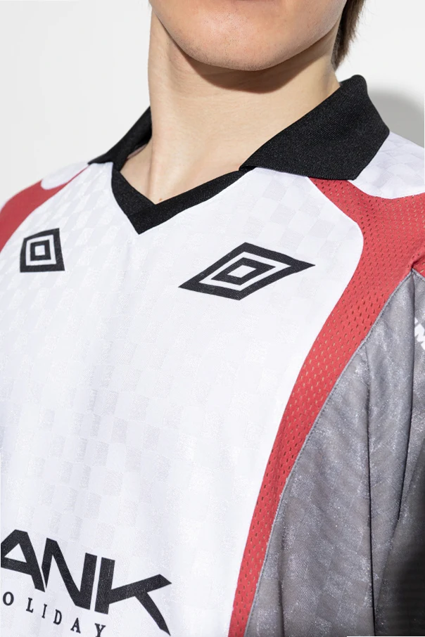 A subtle plaid texture graces the front, while metallic gray shoulder inserts and dynamic red accents impart unmistakable energy. Distinctive Umbro graphic logos are symmetrically positioned on the chest, accompanied by a bold "BANK HOLIDAY" inscription—an emblem of contemporary sport-inspired design.