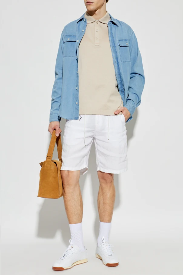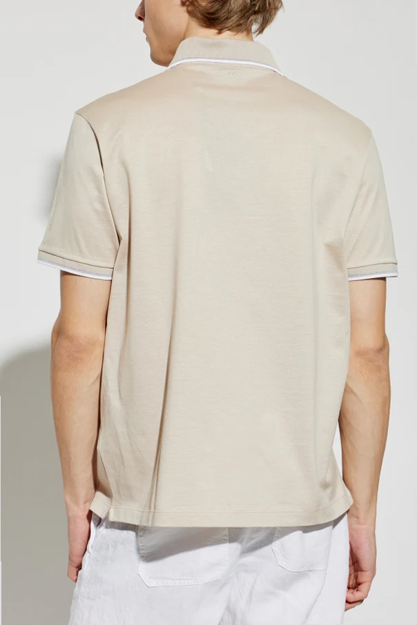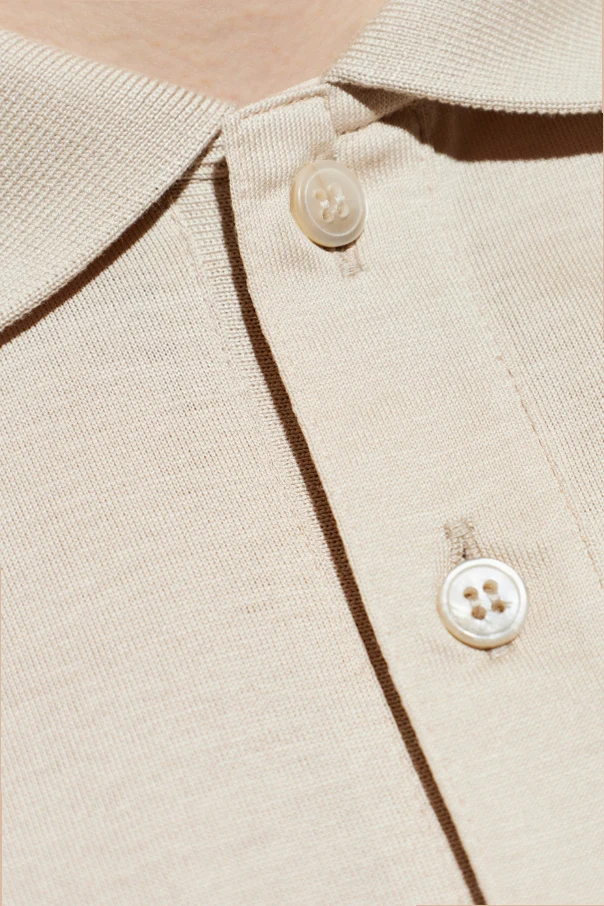 Distinguished by its understated details, this piece is tailored in a traditional silhouette with short sleeves and a gently relaxed fit. The iconic polo collar and sleeve cuffs are finished with slender white piping, creating a subtle contrast and a touch of finesse. Discreet tonal buttons gracefully complete the three-button placket, enhancing the shirt’s seamless aesthetic.