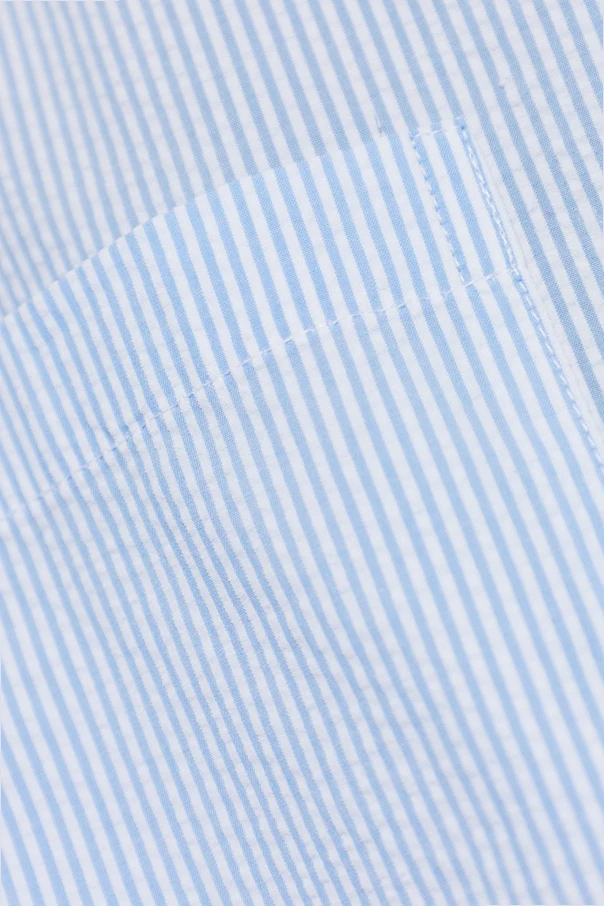 Distinctive vertical pinstripes lend a timeless elegance, while the Cuban collar —expertly trimmed in a deeper blue hue—offers a modern, luxurious accent. Elegant, light buttons run down the front, exuding quiet distinction. Two perfectly shaped chest pockets complete this design, balancing practicality with style.