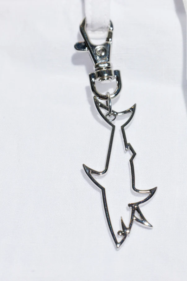Front welt pockets and rear patch pockets ensure practicality, while the front closure with a single prominent button and concealed zipper exudes understated charm. An exquisite metal shark-shaped keychain graces one front belt loop, serving as the designer's hallmark touch of opulence. Subtle white drawstrings at the waist, complete with polished metal tips, provide discreet adjustability and a custom fit.