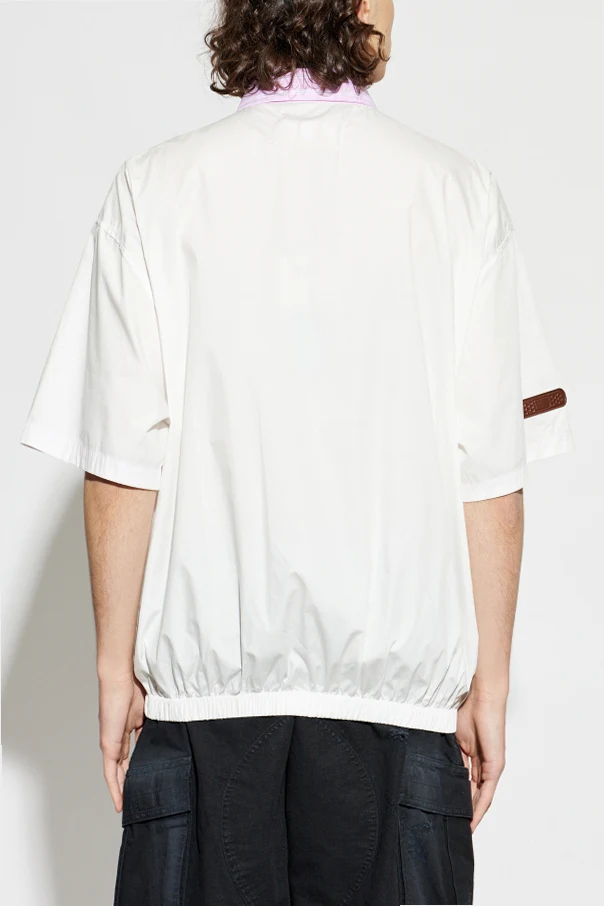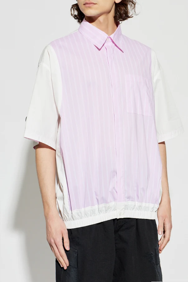 Presenting an exquisite short-sleeve shirt crafted by PDF , a designer renowned for refined sophistication. This shirt showcases a relaxed, subtly oversized silhouette, artfully complemented by an elasticated hem that introduces a touch of sporty elegance. The front is adorned with vertical pale pink and white stripes, while the back and sleeves remain in pristine white , imparting a sense of pure modernity.