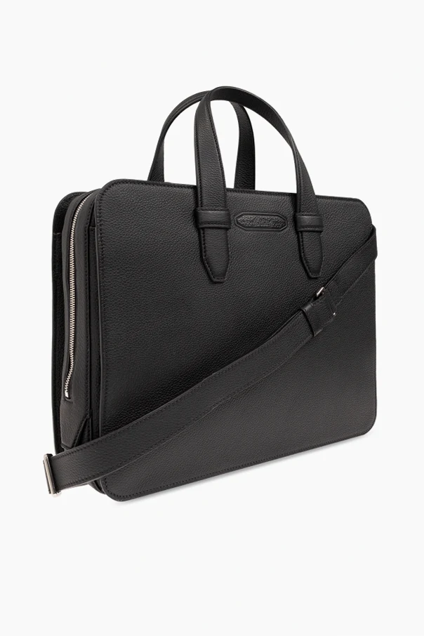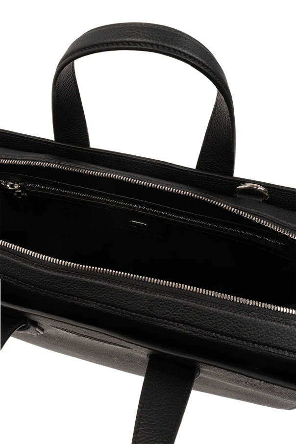 The bag features robust, rounded handles for hand carrying and an adjustable, detachable strap offering versatility to wear it over the shoulder or cross-body. The refined, embossed logo of the designer on the front adds a subtle touch of luxury without overpowering the design's sophisticated simplicity. Enhanced functionality is evident in the addition of a rear flat pocket with a zip closure, allowing for easy access to essential items.